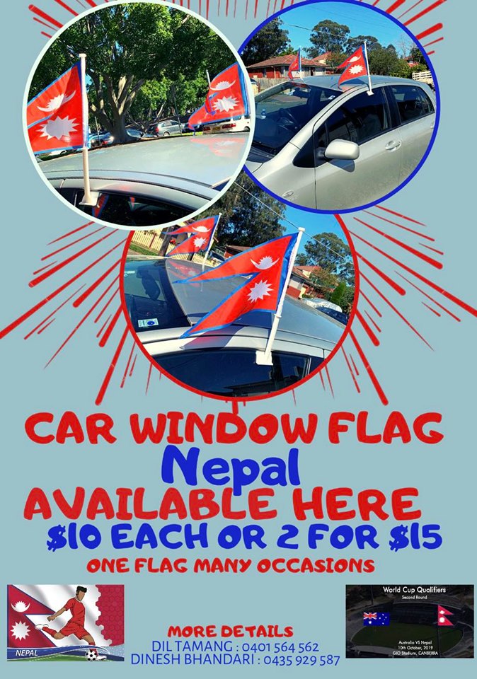 सिड्नी । विश्वकप छनोट अन्तर्गत आगामी अक्टोबर १० तारिखमा क्यानबेराको जिआइओ स्टुडियममा नेपाल र अस्ट्रेलियाबीच फुटबल खेल हुँदैछ । उक्त फुटबल खेलमा नेपाली टोलीलाई हौसला दिन विभिन्न योजना बनाइएको छ । हौसला प्रदान गर्ने योजनामध्ये कार विन्डो फ्लाग (कारमा नेपाली झण्डा फर्फराउने) पनि राखिएको छ ।