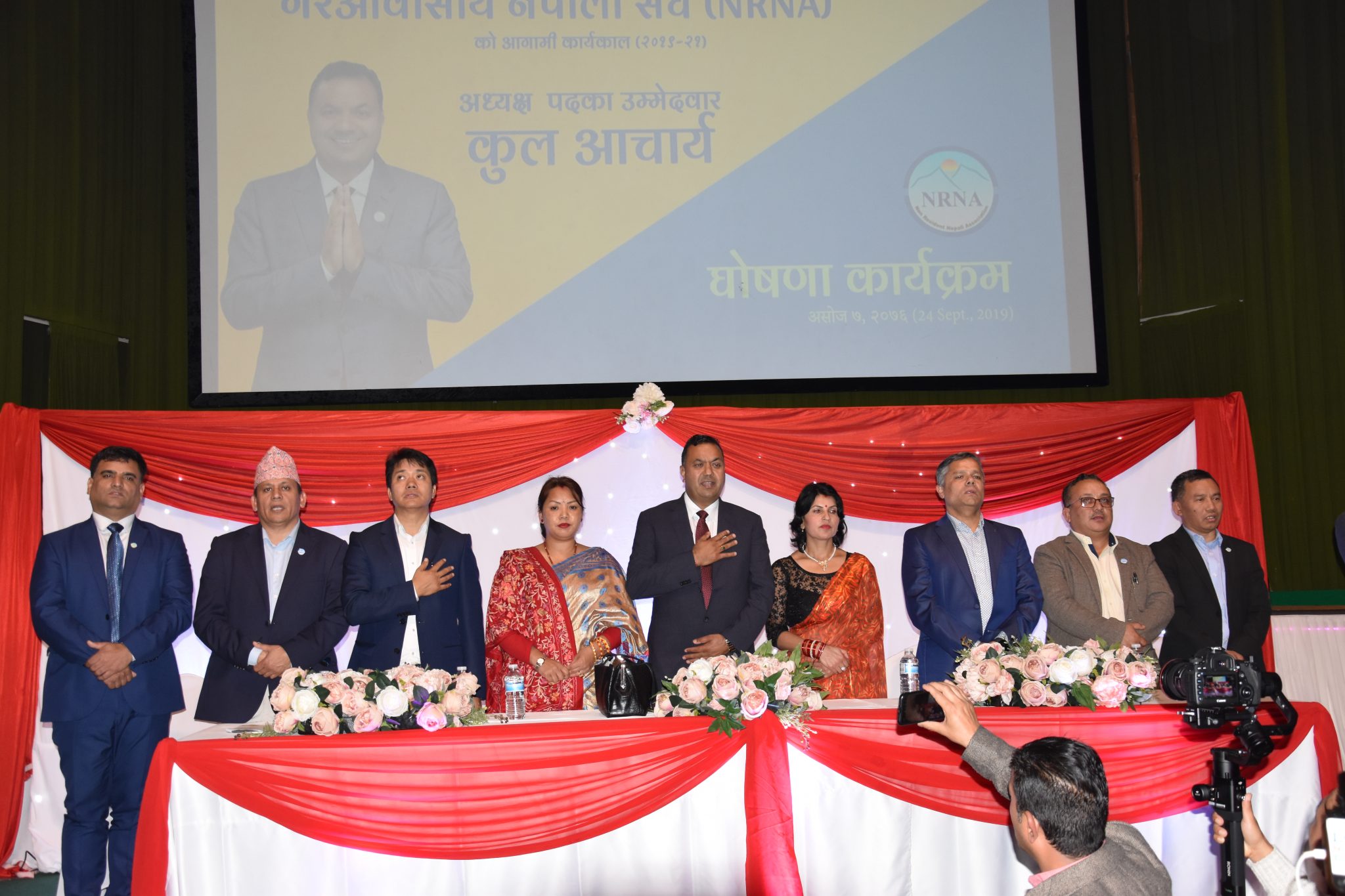लण्डन ।गैरआवासीय नेपाली संघ(एनआरएनए)को आगामी निर्वाचनमा कुल आचार्यलेअध्यक्षको उम्मेदवारी घोषणा गरेका छन् ।बेलायतमा मंगलबार एक कार्यक्रमको आयोजना गरी आचार्यले आफ्नो उम्मेदवारीको घोषणा गरेका हुन् । संघको वर्तमान उपाध्यक्ष समेत रहेका आचार्यले आगामी कार्यकाल २०१९–२०२१ का लागि अध्यक्ष पदमा उम्मेदवारी दिएका हुन्।संघको अधिवेशन आगामी अक्टुबर १५, १६, १७ मा काठमाडौंमा हुँदै छ । सो अधिवेशनले आगामी नयाँ नेतृत्व चयन गर्नेछ ।