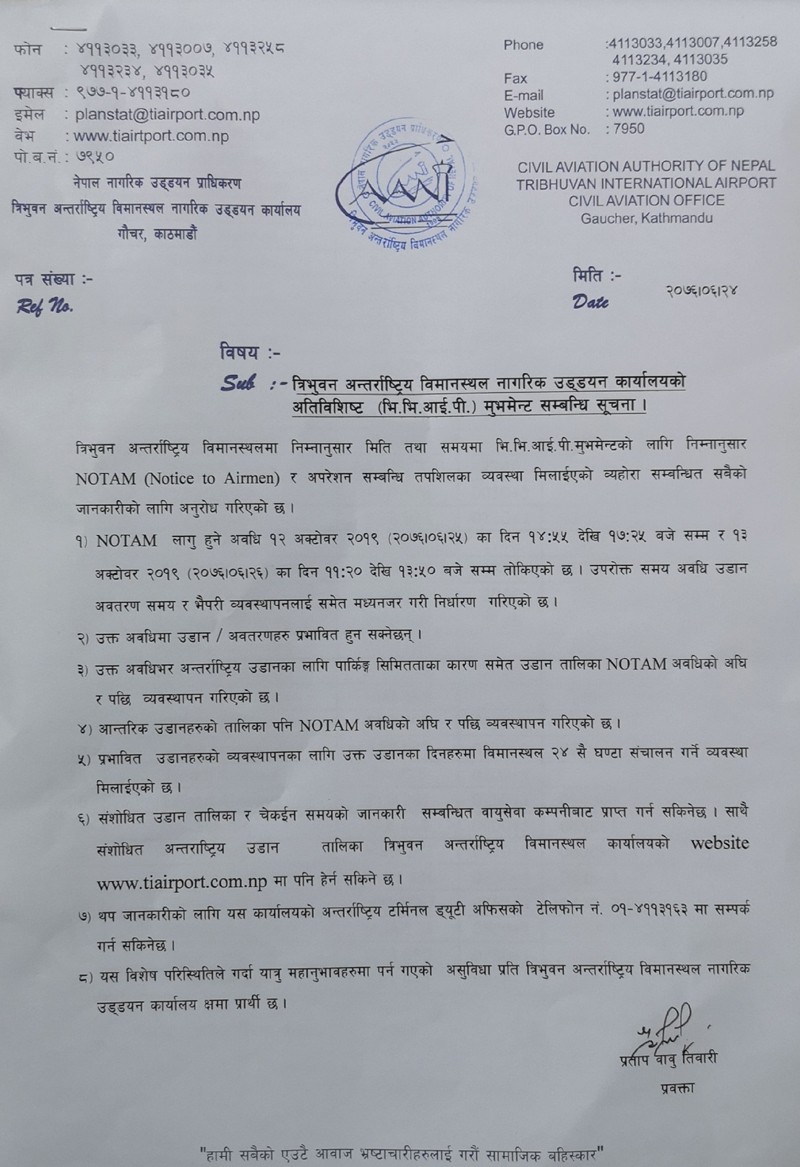 भीभीआईपी मुभमेन्टका लागि आज र भोलि विमान अवतरण तथा उडान केही समयका लागि स्थगित गरिएको त्रिभुवन अन्तर्राष्ट्रिय विमानस्थलले सूचना जारी गरी जानकारी दिएको छ । आज अपराह्न १४:५५ देखि १७:५५ बजेसम्मका उडान प्रभावित हुने छन् ।