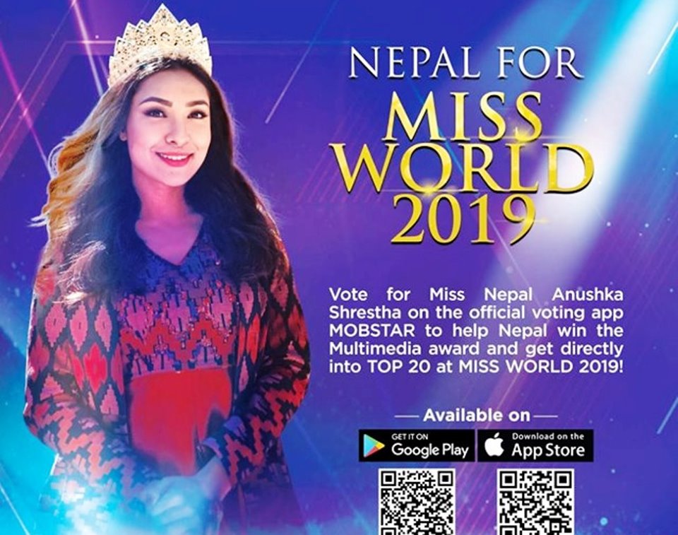 लन्डनमा आयोजना हुन लागेको मिस वल्र्ड प्रतियोगितामा नेपालको तर्फबाट मिस नेपाल अनुष्का श्रेष्ठले प्रतिनिधित्व गर्दैछिन् । मिस नेपाल श्रेष्ठलाई मिस वल्र्डको मल्टी मिडिया अवार्ड जिताउन अर्थात् टप–२० भित्र पर्नको लागि सहयोगको आवश्यकता पर्छ ।