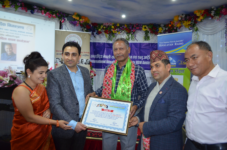 सिड्नी । सिड्नीको रगडेलमा रहेको एभरेष्ट फंङ्सन सेन्टरमा हिजो आइतबार कवि एवम् गीतकार दिनेश अधिकारीको एकल कविता बाचन सम्पन्न भयो । ‘यो सम्झिने मन छ, म बिर्सु कसोरी, तिमी नै भनिदिउ हे जाने निठुरी’, ‘सोचेजस्तो हुन्न जीवन, देखेजस्तो हुन्न जीवन’ जस्ता कालजयी गीतका रचयता अधिकारीको एकल प्रस्तुतिको चाँजोपाँजो अन्तर्राष्ट्रिय नेपाली साहित्य समाज (अनेसास) न्यू साउथ वेल्सले मिलाएको थियो ।