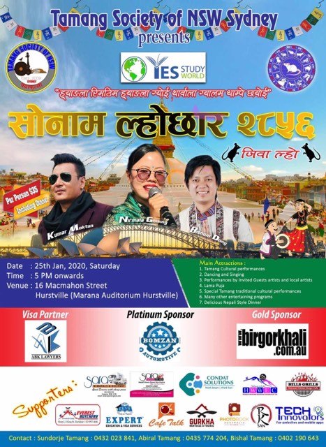 सिड्नी । सोनाम ल्होछार २०५६ ‘जिवा ल्हो’ (मुसा वर्ष) को उपलक्ष्यमा तामाङ समुदायले विश्वभरि नै आफ्नो धर्म, संस्कृति र भाषाको जर्गेनामा जुटिरहँदा सिड्नीमा रहेका तामाङ समुदायको प्रतिनिधि संस्था तामाङ सोसाइटी अफ एनएसडब्लुले पनि भव्यरुपमा आयोजना गर्ने भएको छ ।