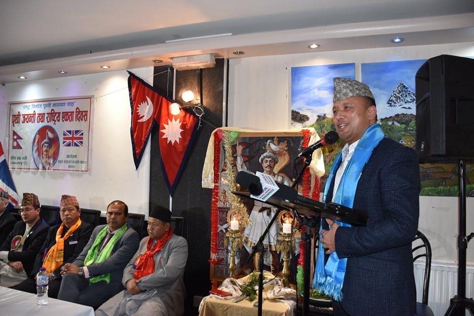 संगठनका अध्यक्ष भरत रोका क्षेत्रीको अध्यक्षतामा भएको कार्यक्रममा प्रमुख अतिथी लन्डनस्थित नेपाली दूतावासका उपनियोग प्रमुख शरदराज आरनले अर्थवीद र कूटनीतिज्ञ समेत रहेका पृथ्वी नारायणको दिव्योपदेश, अर्थ एवं सैन्य नीति समृद्ध नेपाल निर्माणमा अहिले पनि सान्दर्भिक भएको धारणा राखे । आरनले पृथ्वीनारायणप्रति नकारात्मक टिप्पणी वा अफवाह फैलाउनुको सट्टा उनका ऐतिहासिक दस्तावेज नयां नेपाल निर्माणमा लगाउन आग्रह गरे ।