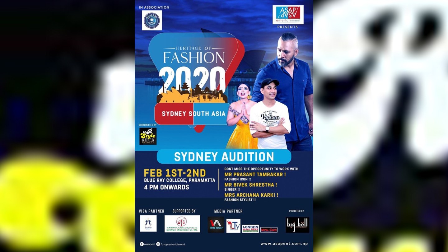 सिड्नी । हेरिटेज अफ फेसन २०२० सिड्नी साउथ एसिया को अडिसन फेब्रुअरी १ र २ मा आयोजना हुने भएको छ । असाप इन्टरटेन्मेन्टले आयोजना गरेको उक्त कार्यक्रम सिड्नीको ब्लु बे कलेज पारामाटामा हुने आयोजकले जनाएका छन् । अस्ट्रेलियामा हालै भएको आगलागीबाट प्रभावित र पोखरा साराङकोटका क्यान्सर पीडितको सहयोगार्थ कार्यक्रम आयोजना गर्न लागिएको मुख्य आयोजक असाप इन्टरटेन्मेन्टका निर्देशक सन्तोष अधिकारीले जानकारी दिए ।