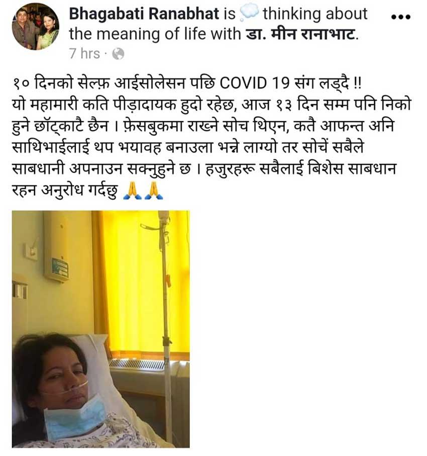औषधिले निको नभएपछि गत १८ तारिख बुधबार हस्पिटल गएर एक्सरे गरेपछि एन्टिकायोटिक लिइरहेकी उनलाई शुक्रबार घरैमा एम्बुलेन्स आएर अस्पताल लगेको बताइएको छ। उनलाई संक्रमण भएपछि श्रीमान् डा.मीन रानाभाट सहित एक छोरा र छोरी अहिले घरमा सेल्फ आइसोलेसनमा छन्।