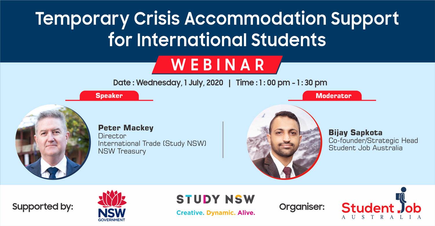सिड्नी ।  न्यू साउथ वेल्स (एनएसडब्लु) राज्यमा अध्ययनरत अन्तर्राष्ट्रिय विद्यार्थीले निःशुल्क ३ देखि ५ महिनासम्म आवास सुविधा पाउने भएका छन् ।   एनएसडब्लु सरकारले अन्तर्राष्ट्रिय विद्यार्थीलाई यो सुविधा उपलब्ध गराएको छ । सरकारले त्यसका लागि २० लाख डलर बजेट विनियोजन गरिसकेको सिसाका पूर्वअध्यक्ष तथा स्टुडेन्ट जब अस्ट्रेलियाका सहसंस्थापक विजय सापकोटाले जानकारी दिए ।