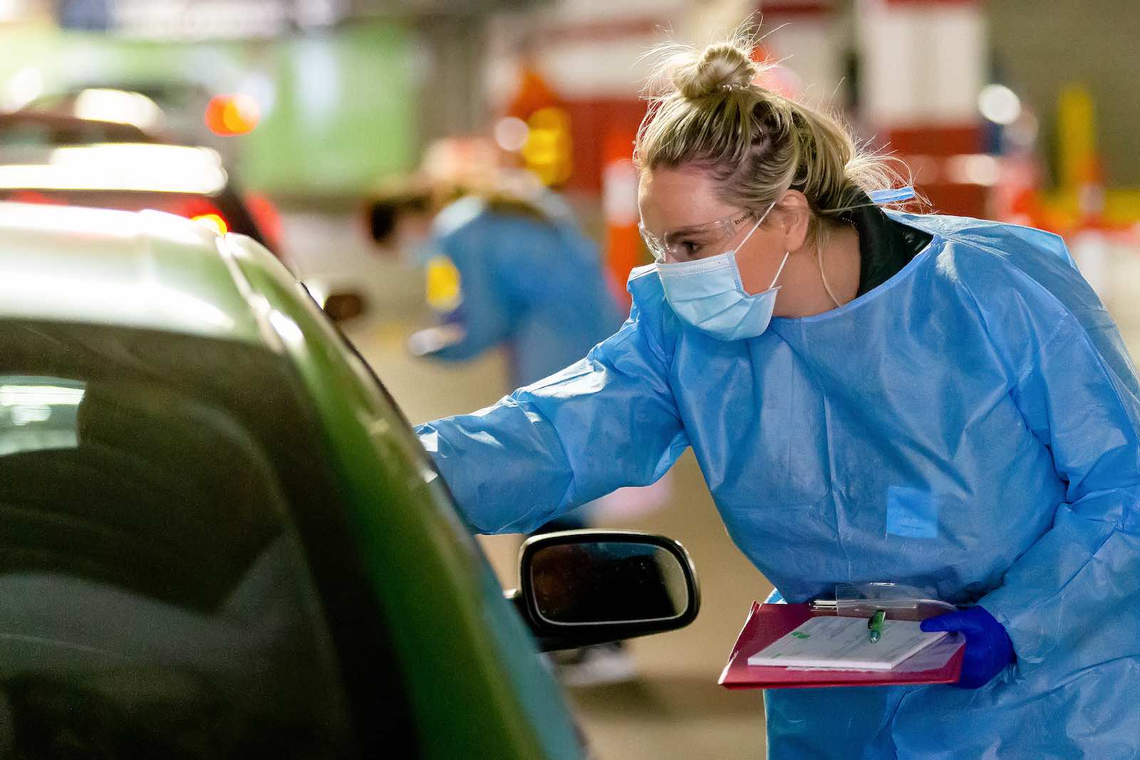 MELBOURNE, AUSTRALIA - APRIL 30: A nurse wearing full PPE takes swabs in the Pacific Epping Shopping Centre where one of the new mobile testing sites is located during COVID 19 on 30 April, 2020 in Melbourne, Australia. (Photo by Speed Media/Icon Sportswire)