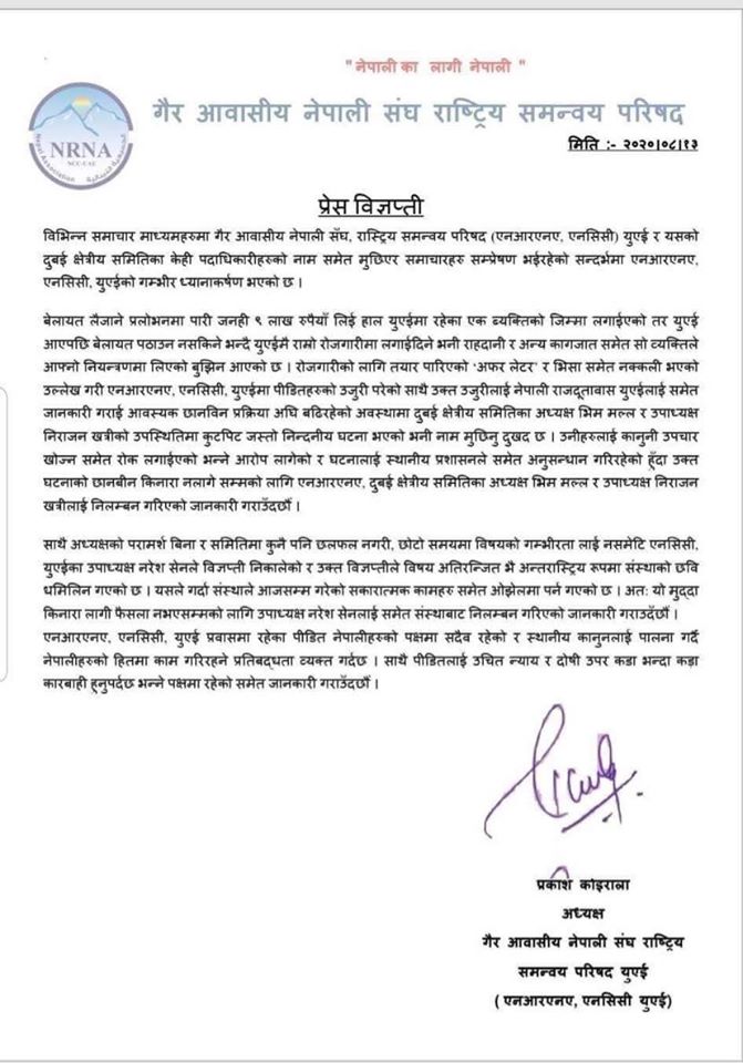बिहीबार एनआरएनए एनसीसी यूएईका अध्यक्ष प्रकाश कोइरालाले एक प्रेस विज्ञप्ति जारी गर्दै कुटपिटमा संलग्न भएको आरोप लागेका एनआरएनए दुबई क्षेत्रका क्षेत्रीय अध्यक्ष भीम मल्ल ठकुरी र उपाध्यक्ष निराजन खत्रीलाई अनुसन्धान नसकिँदासम्मको लागि निलम्बन गरेको जनाएका छन् । त्यस्तै पीडितहरु कुटिएको विषयमा संस्थाको निर्णयबिना एकलौटी ढंगले विज्ञप्ति जारी गरेको आरोपमा एनआरएनए एनसीसी यूएईका उपाध्यक्ष नरबहादुर सेनलाई समेत निलम्बन गरिएकाे छ ।