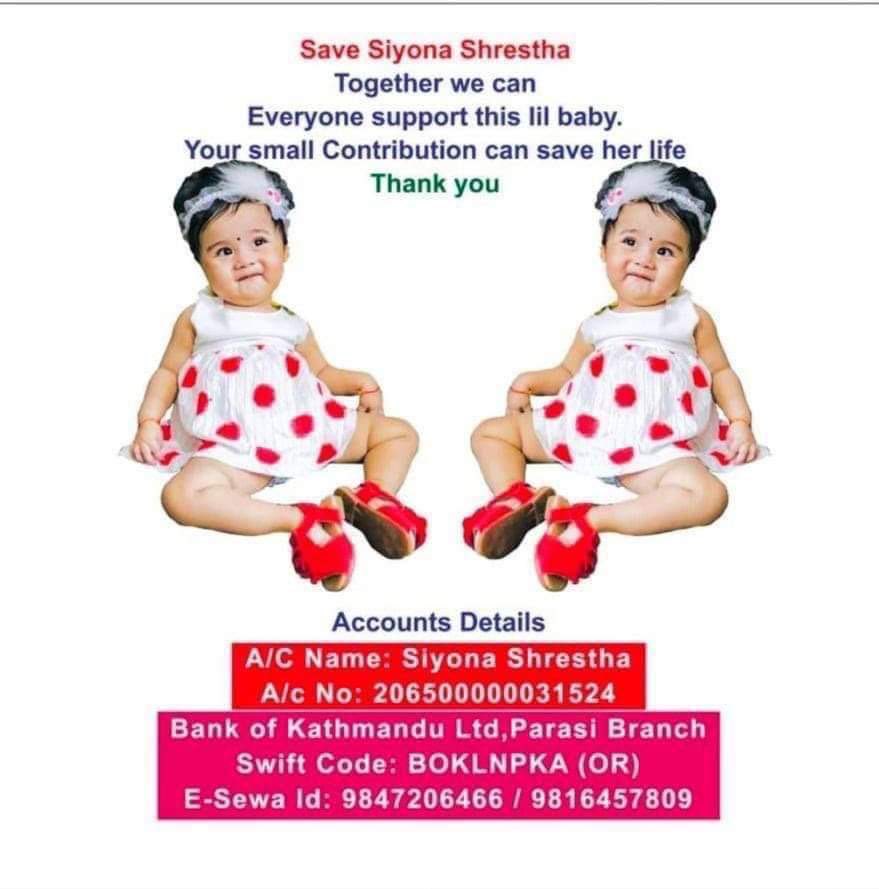 युनिभर्सल कलेज अफ मेडिकल साइन्सेस टिचिङ्ग हस्पिटलमा जचाउन लगेको समय उनलाइ उक्त समस्या रहेको पुष्टि भएको थियो । अमेरिकामा मात्रै उपचार सम्भव रहेको उक्त रोगको उपचारकोे निम्ती २१ लाख अमेरिकी डलरको खाँचो पर्दछ । त्यसको नेपाली रकम २४ करोड ६९ लाख भन्दा बढी हुन्छ । यति ठुलो मात्रामा खर्च लाग्ने भएको कारण परिवारको आर्थिक स्थितीले थेग्न नसक्दा यतिवेला विश्वभर रकम संकलन अभियान जारी छ । उनको दुइ बर्ष भित्र उपचार गरिसक्नुपर्ने र एक बर्षभित्रमा उपचार शुरु गरिसक्नु पर्ने हुन्छ । सियोनाको उपचारको निम्ती सहयोग गर्न चाहनेहरुको निम्न खाता नम्बरमा रकम जम्मा गरिदिन सक्नुहुनेछ ।