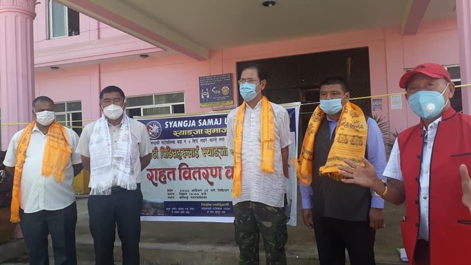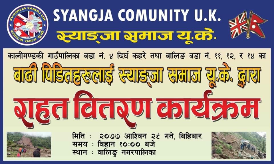 समाजले स्याङ्जा कालिगण्डकी गाउँपालिका वडा नं. ४ बिर्घा, खहरे, कट्टे गाँउ तथा वालिङ नगरपालिका वडा नं.११, १२ र १४ का बाढी पहिरो पीडितहरुलाई बिहीबार २ लाख रुपैयाँ राहत वितरण गरेको हो।