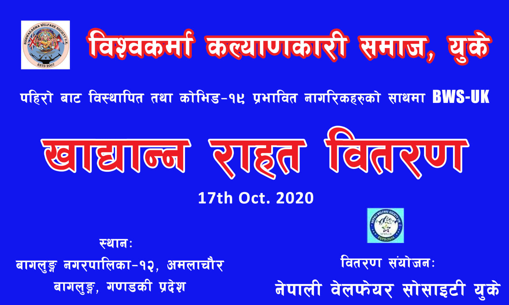 लण्डन । बेलायत स्थित विश्वकर्मा वेलफेयर सोसाइटी यूकेको आयोजना र नेपाली वेलफेयर सोसाईटी यूकेको संयोजन तथा समन्वयमा “बाँचौ र बचाऊ अभियान” अन्तर्गत नेपालको बाग्लुङ्गमा राहत वितरण गरिएको छ । गण्डकी प्रदेश अन्तर्गतको बाग्लुङ्ग जिल्ला बाग्लुङ्ग नगरपालिका १२ अमलाचौरका ६७ विपन्न परिवारहरुलाई खाद्यान्न वितरण गरिएको हो ।