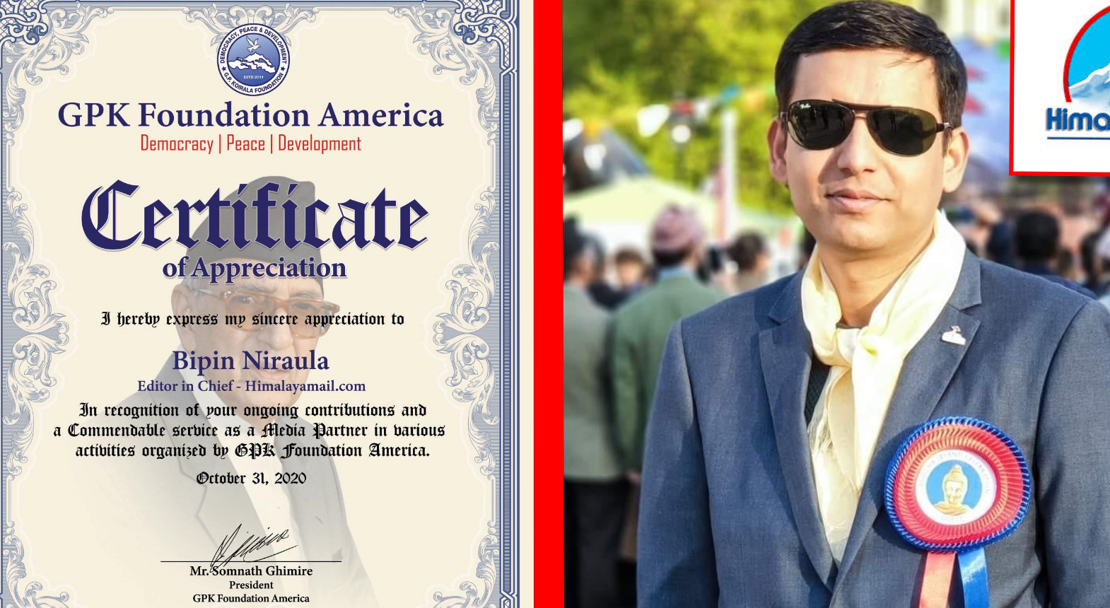 लण्डन । गिरिजा प्रसाद कोइराला (जिपिके) फाउण्डेशन अमेरिकाले कोभिड –१९ को संक्रमणबाट नेपाली समुदायलाई जोगाउन सकृय भूमिका निर्वाह गर्ने विपिन निरौलासहितका दर्जनौ पत्रकारहरुलाई सम्मान गरेको छ । निरौला बेलायतमा संचालित हिमालयमेल डटकमका प्रधान सम्पादक हुन ।