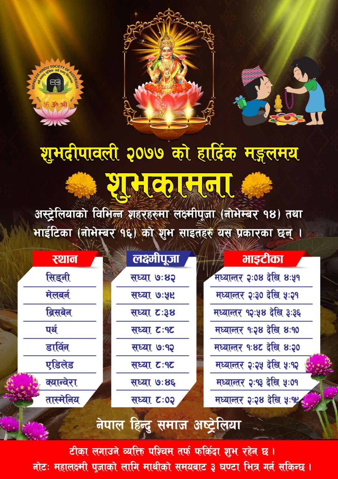 सिड्नी। नेपाली हिन्दु समाज अष्ट्रेलियाले यस बर्ष देशका विभिन्न शहरहरुमा लागू हुने गरी दीपावलीका विभिन्न साइतहरु सार्वजनिक गरेको छ । यस बर्ष १४ नोभेम्बरमा लक्ष्मीपुजा परेको छ भने १६ नोभेम्बरमा भाइटीका परेको छ ।