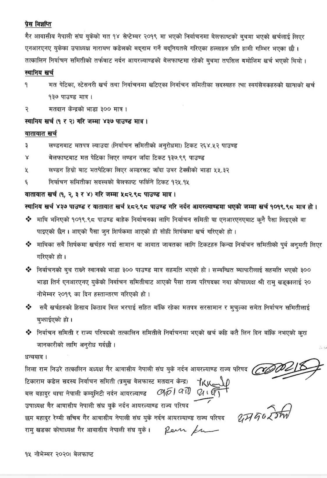 यसैबीच एनआरएन युकेको नर्दर्न आयरल्याण्ड राज्यपरिषद्का निवर्तमान अध्यक्ष लिलाराम निउरे, मतदान केन्द्रका प्रमुख (निर्वाचन समिति सदस्य) टिकाराम कँडेल , नेपाली कम्युनिटी नर्दर्न आयरल्याण्डका अध्यक्ष बलबहादुर थापा, निर्वाचनमा खटिएका स्वयंसेवक तथा सचिव छमबहादुर रेग्मी, कोषाध्यक्ष रामु खड्काले एक संयुक्त विज्ञप्ति प्रकाशित गरी ‘सम्बन्धित व्यापारीलाई सहमति भएको ३०० पाउण्ड तिर्न एनआरएन युकेको निर्वाचन समितिबाट आएको पैसा राज्य परिषद्का नयाँ कोषाध्यक्ष रामु खड्कालाई २० नोभेम्बर २०१९ का दिन हस्तान्तरण गरिएको’ उल्लेख गरेका छन् । विज्ञप्तिमा एनआरएन युकेका उपाध्यक्ष नारायण कँडेलको बदनाम गर्ने बदनियतले गरिएका हल्लाहरुप्रति आफुहरु गम्भीर भएको पनि जनाइएको छ ।