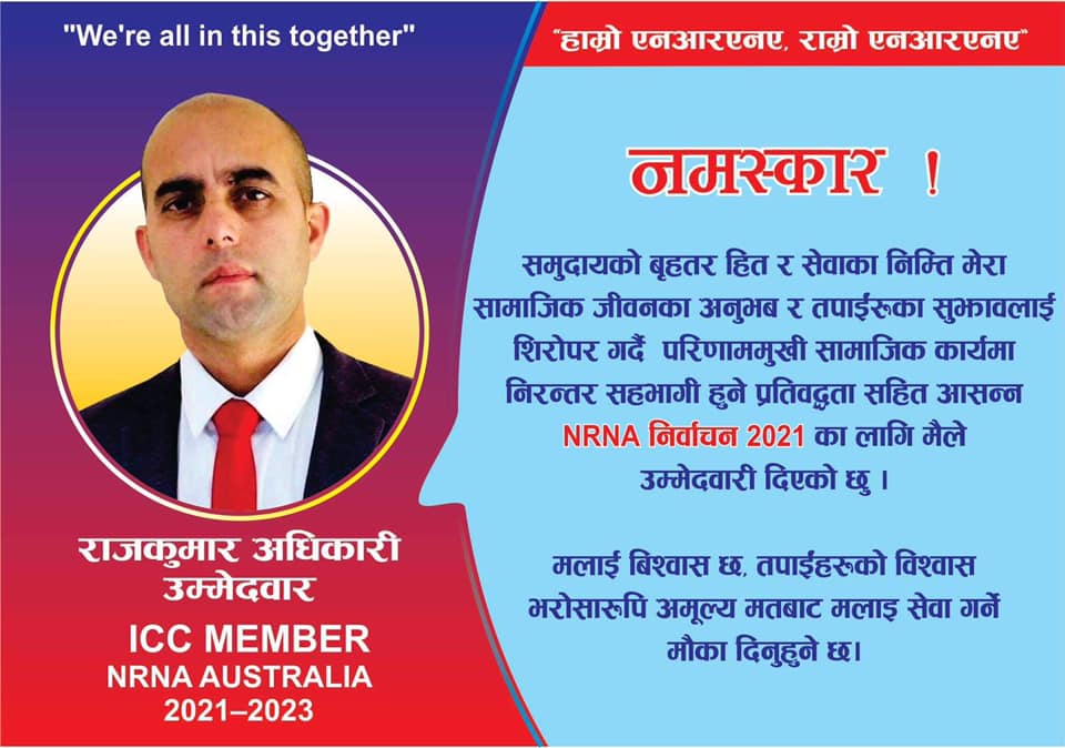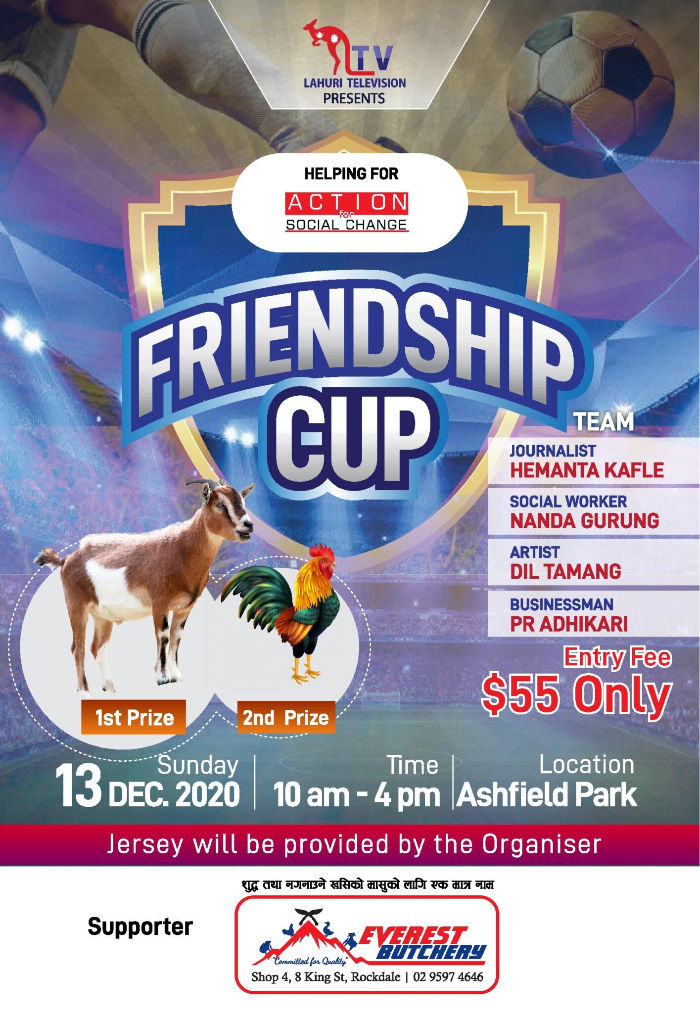 सिड्नी । अष्ट्रेलियाको सिड्नीमा फ्रेन्डसिफ कप २०२० सञ्चालन हुँदैछ । कोभिड १९ महामारीको कारण आइसोलेटेड मानिसहरुलाई नजिक ल्याउने तथा मानसिक तनावमा रहेका मानिसहरुलाई फाइदा पुर्याउने उद्धेश्य सहित मैत्रीपूर्ण फुटवल आयोजना गरिएको हो । आउने १३ डिसेम्बर गते आइतवारको दिन विहान १० देखि ४ बजेसम्म एशफिल्ड पार्कमा कार्यक्रम हुनेछ । प्रतियोगीतामा पत्रकार, समाजसेवी, व्यवसायी र कलाकारहरुको ४ समूहवीच प्रतिस्पर्धा हुनेछ । सहभागि हुने खेलाडी समूहको लागि विधागत रुपमा संयोजक चयन गरिएको छ । पत्रकारको संयोजकमा हेमन्त काफ्ले, कलाकारहरुको संयोजक दिल तामाङ्ग, समाजसेवीहरुको संयोजकमा नन्द गुरुङ्ग तथा व्यवसायीहरुको समूह संयोजकमा पिआर अधिकारी रहेका छन् । एक समूहमा १५ जना खेलाडी सहभागि हुने र उनीहरुलाई जर्सीको व्यवस्था आयोजकले नै गर्ने लाहुरी टिभीका प्रबन्धक जीवन डीसीले बताए । जसमा पहिलो हुने टिमले एक बोका तथा दोस्रो हुनेले लोकल कुखुरा पाउने आयोजकले जनाएको छ ।