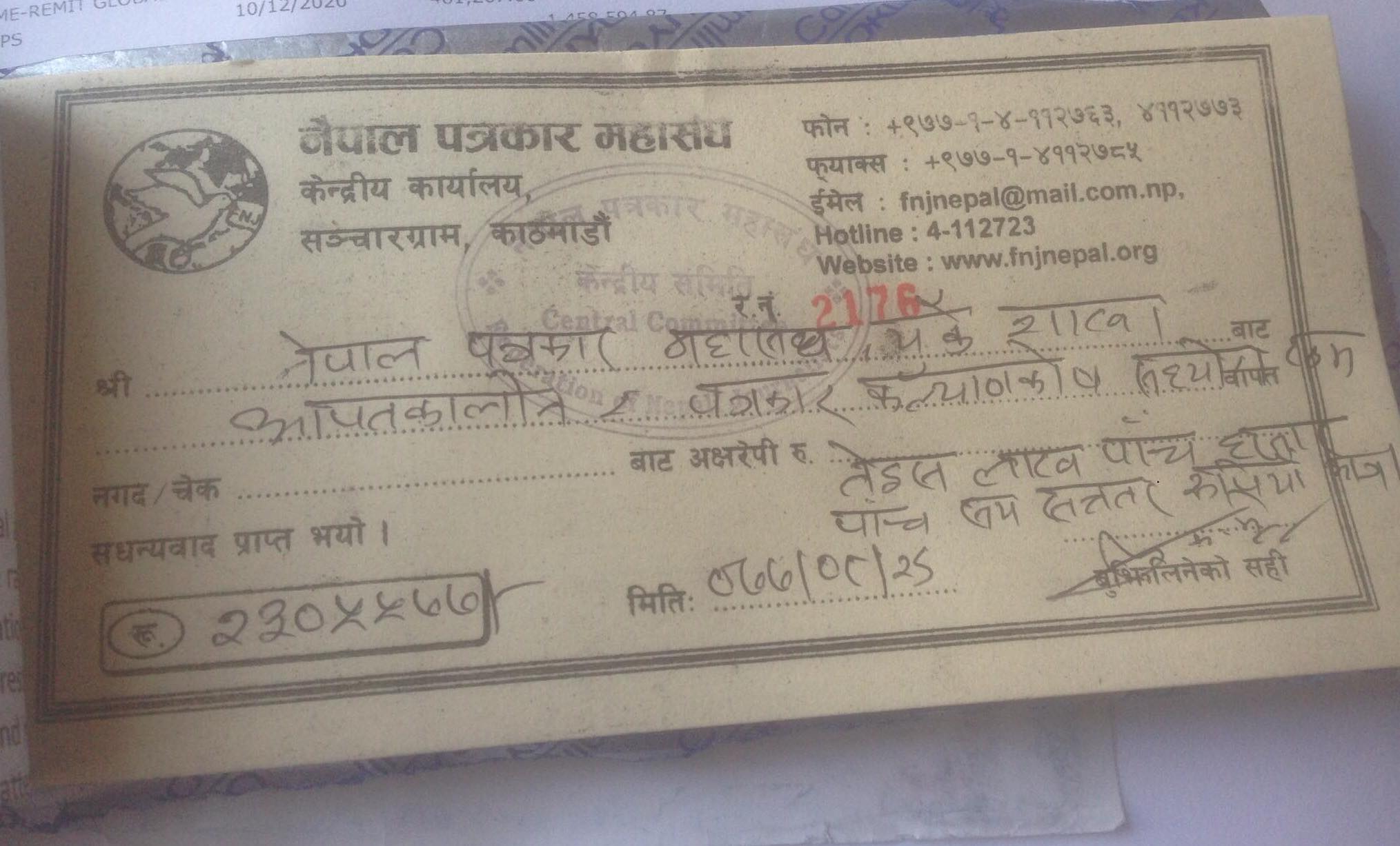 लण्डन । नेपाल पत्रकार महासंघ युके शाखाले कोरोना पीडित नेपाली पत्रकारहरुका लागि स्थापित कोषमा २३ लाख रुपियाँ जम्मा गरेको छ ।