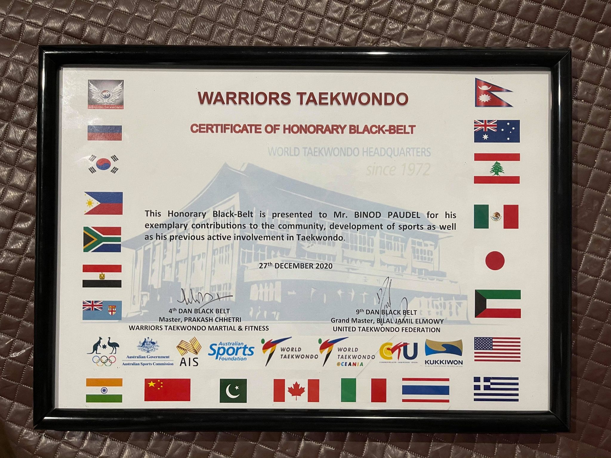 सिड्नी । सिड्नीमा सम्पन्न भएको दोस्रो वरिवर तेक्वान्दो च्याम्पियनसिपमा समाजसेवी तथा युवा उत्प्रेरक विनोद पौडेललाई मानार्थ ब्लाकबेल्ट सहित सम्मान गरिएको छ । आइतवार वरिवर तेक्वान्दो र युनाइटेड तेक्वान्दो फेड्रेसन (युटीएफ) द्वारा संयुक्त रुपमा आयोजित प्रतियोगितामा पौडेललाई मानार्थ ब्ल्याक बेल्ट सहित सम्मान गरिएको हो । पौडेललाई वरिवर तेक्वान्दो बोर्ड सदस्य विलाल इलमोई, तथा प्रशिक्षक प्रकाश क्षेत्रीले प्रमाणपत्र तथा तेक्वान्दो युनिफर्म सहित ब्ल्याक बेल्ट पहिराईदिएर सम्मान गरेका थिए ।