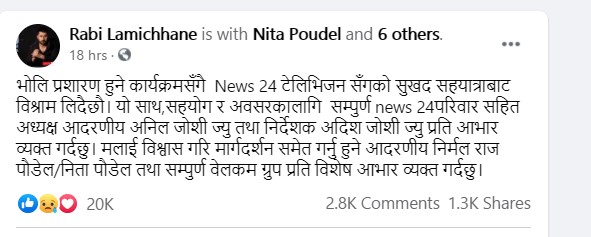बुधबार साँझ फेसबुकमा एक स्टाटस लेख्दै उनले सो कुराको जानकारी दिएका छन् ।