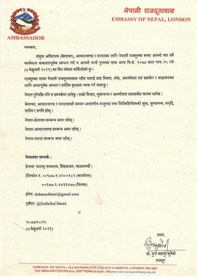 उप-नियोग प्रमुख/काउन्सेलर रोशन खनालद्वारा जारी बिज्ञप्तीमा भनिएको छ,- ‘संयुक्त अधिराज्य, आयरल्याण्ड तथा माल्टाका लागि नेपाली राजदूत महामहिम डा. दुर्गाबहादुर सुवेदीज्यू आफ्नो कार्यकाल सफलतापूर्वक सम्पन्न गरी आज स्वदेश प्रस्थान गर्दै हुनुहुन्छ। हामी उहाँको सुखद यात्राको निम्ति हार्दिक शुभकामना व्यक्त गर्दछौं। महामहिम डा. सुवेदीलाई नेपाल सरकारबाट महत्वपूर्ण जिम्मेवारी प्राप्त हुनेछ भन्ने शुभकामना समेत व्यक्त गर्दछौं। हामी उहाँ र उहाँको धर्मपत्नी श्रीमती पुनम सुवेदीज्यूको सुख, सु-स्वास्थ्य, समृद्धि, उज्जवल भविष्य एवं उत्तरोत्तर प्रगतिको लागि हार्दिक मंगलमय शुभकामना व्यक्त गर्दछौं।’