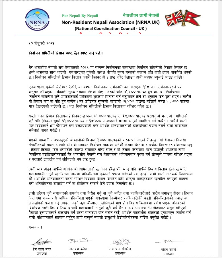 ‘यो बेलायत निवासी नेपालीहरुको साझा सम्पत्ति हो । यो लगायत निर्वाचनताका अनेकौं हिसाब किताब र खर्चका विवरणहरु शंकास्पद छन् । हिसाब किताब, वील भरपाइको विवरण हामीबाट गोप्य राख्नु र यो हिसाव किताबमा प्रश्न उठाएकै आधारमा हामी निर्वाचित पदाधिकारीहरुलाई गैर आवासीय नेपाली संघ बेलायतको अभियानबाट पृथक गर्न खोज्नुले मामिला गम्भीर भएको र यसलाई ढाकछोप गर्न खोजिएको थप प्रष्ट हुन्छ’, विज्ञप्तिमा उनीहरुले भनेका छन् ।