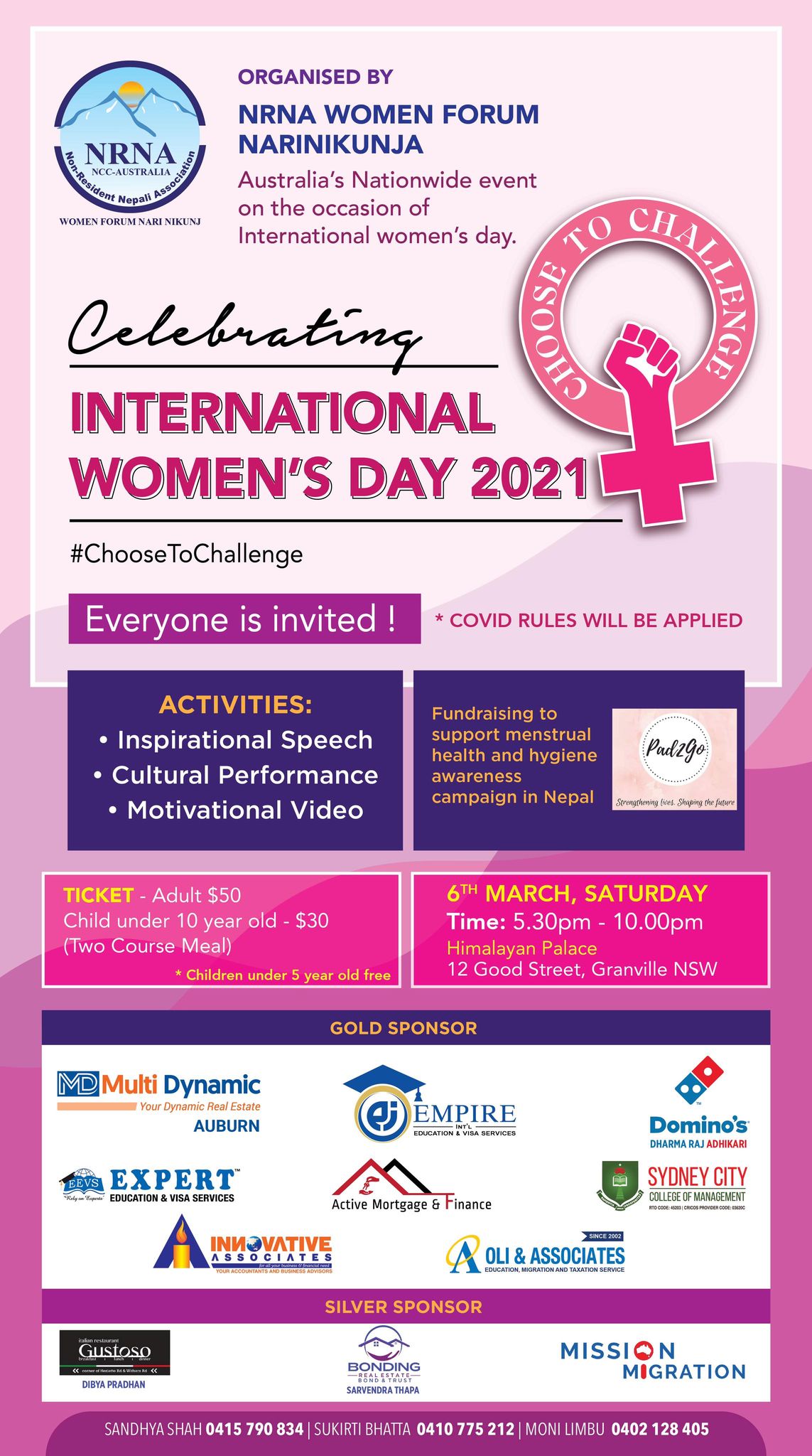 नारी निकुञ्जले हरेक बर्ष अन्तराष्ट्रिय महिला दिवसको अवसरमा महिलासम्बन्धी सचेतनाका कार्यक्रम गर्दै आएको छ । महिलाको हकहीतका निम्ती बर्षभरी नै आवाज उठाउँदै आएको नारी निकुञ्जले यस पटक आयोजना गरेको सो चूज टू च्यालेन्ज कार्यक्रममा अष्ट्रेलियामा रहेका संघसंस्थासँग समन्वय गर्ने जनाएको छ ।