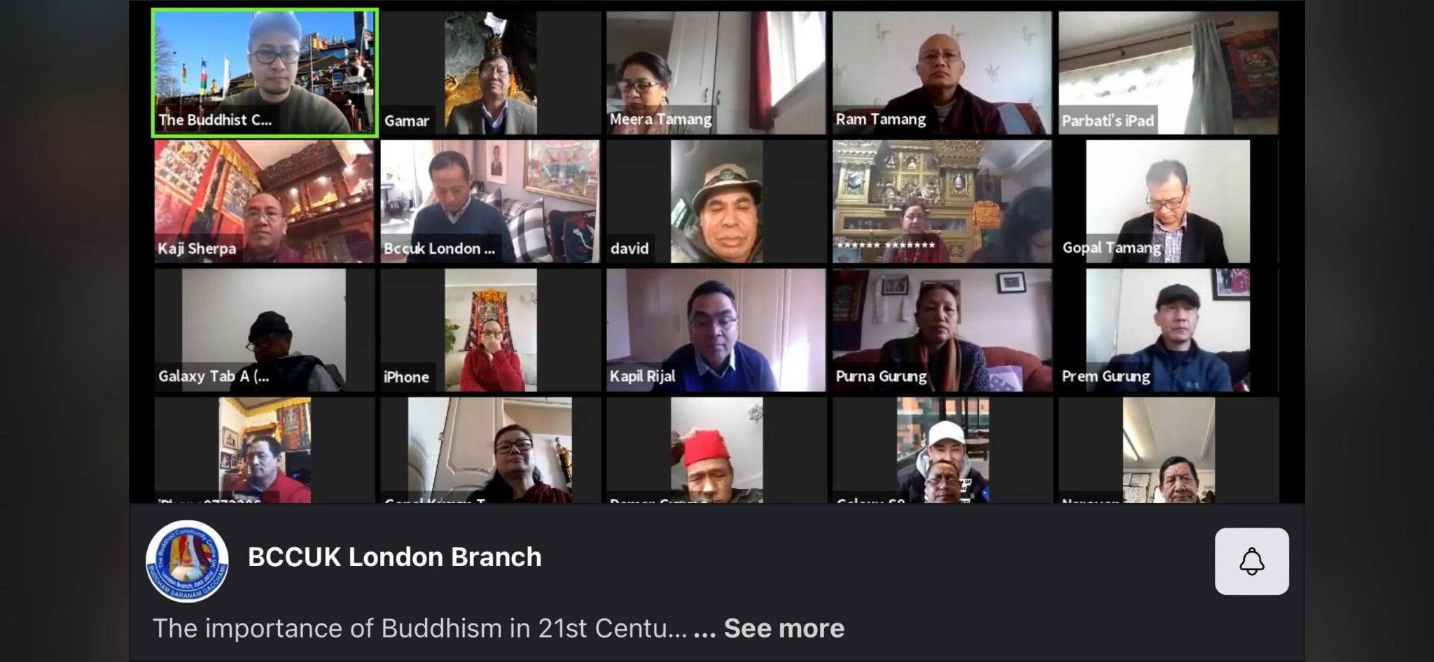 लण्डन । बिसीसी लन्डन इकाईले २१ औं शताब्दीमा बौद्ध धर्मको महत्वबारे विशेष प्रशिक्षण सम्पन्न गरेको छ । जुम प्रविधिमार्फत भर्चुअल रूपमा आयोजना गरिएको उक्त प्रशिक्षणमा बौद्ध धर्मका प्रसिद्ध टुल्कु जमुयांग रिनपोछे Tulku Jyamyang Rinpochhe गुरूले बुद्ध धर्मको महत्वको विशेषमा प्रवचन दिएका थिए ।