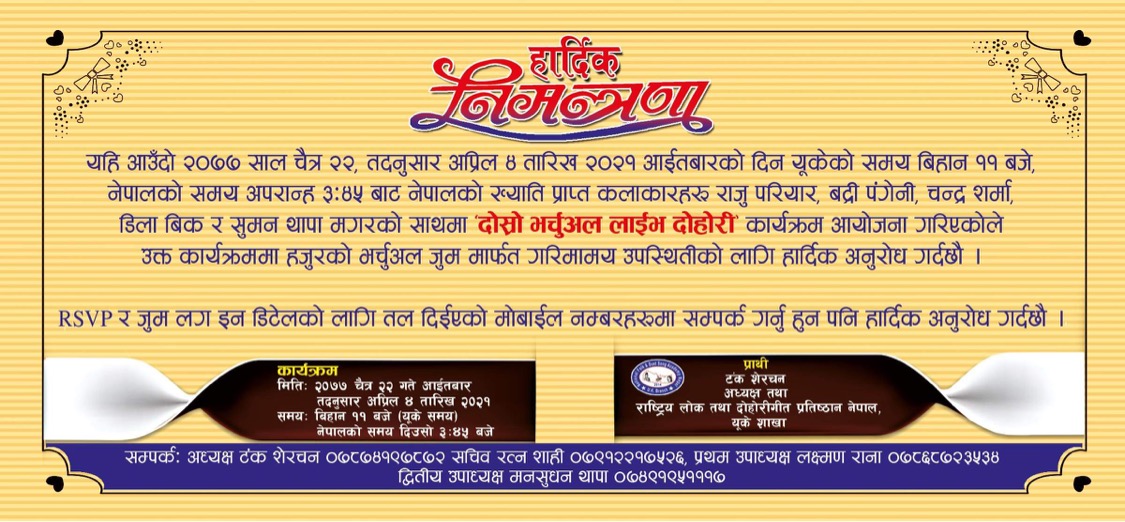लण्डन । राष्ट्रिय लोक तथा दोहोरी गीत प्रतिष्ठान नेपाल युके शाखाले दोस्रो भर्चुअल लाईभ दोहोरी गर्नेभएको छ ।