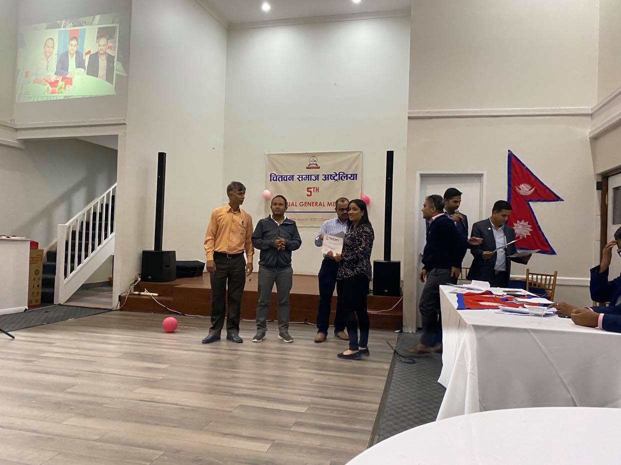 सिडनी । चितवन समाज अस्ट्रेलियाको पाँचौं वार्षिक साधारणसभा सम्पन्न भएको छ । साधारणसभाले पूर्णनाथ घिमिरेलाई अध्यक्षमा निर्वाचित गरेको छ । समाजको उपाध्यक्षमा विकास बर्तोला, कोषाध्यक्षमा सीता सुवेदी, सहसचिवमा कृष्णकान्त पौडेल, प्रवक्तामा श्यामसुन्दर गिरी, जनसम्पर्क संयोजकमा पुरुषोत्तम संग्रौला रहेका छन् ।