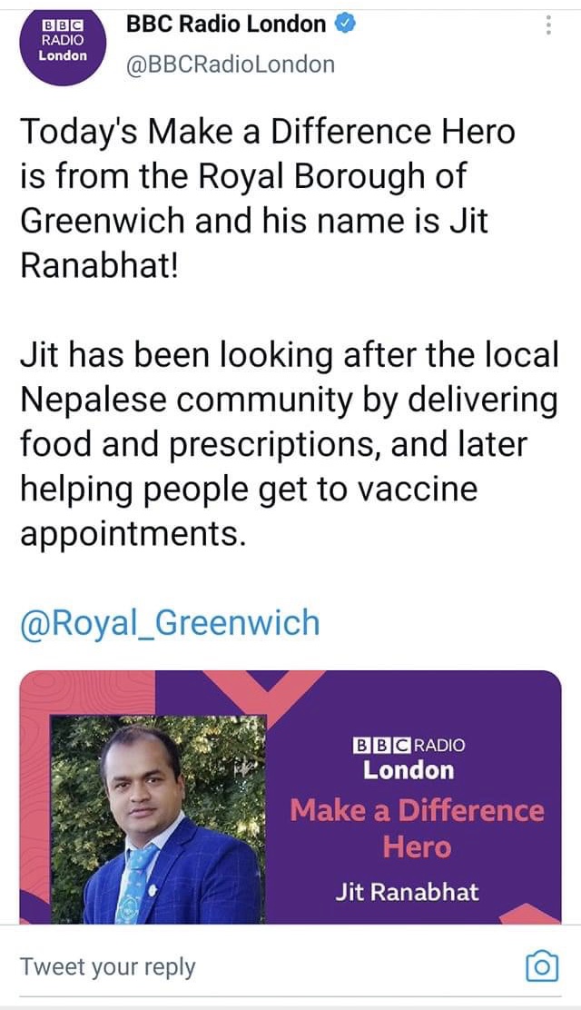 लन्डन ।कोरोना महामारीका बेला स्थानीय स्तरमा योगदान दिएको भन्दै बीबीसी रेडियो लन्डनले जीत रानाभाटलाई कदर गरेको छ ।रानाभाट रोयल बरो अफ ग्रीनवीच नेप्लिज् सोसाइटी (आरजीएनएस) अध्यक्ष एवम् एनआरएनए यूके सचिव हुन् ।