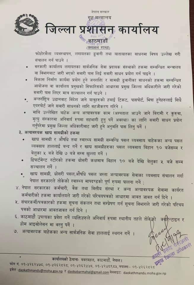 सरकारी कार्यालय, बैंक तथा वित्तीय संस्था र अरु अत्यावश्यक सेवा दिने कार्यालय भने सञ्चालन हुनेछ । सरकारी कर्मचारी, बैंक तथा वित्तीय संस्था र अरु अत्यावश्यक सेवामा कार्यरत कर्मचारीले आफ्नो परिचयपत्र देखाएर आवतजावत गर्न सक्ने आदेशमा उल्लेख छ ।