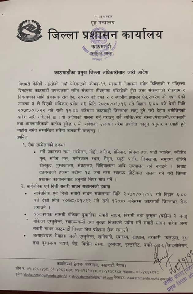 काठमाडौं, भक्तपुर र ललितपुर जिल्लाका प्रमुख जिल्ला अधिकारीहरुले सोमबार साँझ एक आदेश जारी गरी अत्यावश्यक सेवाबाहेकका सेवा बन्द गरेको हो ।