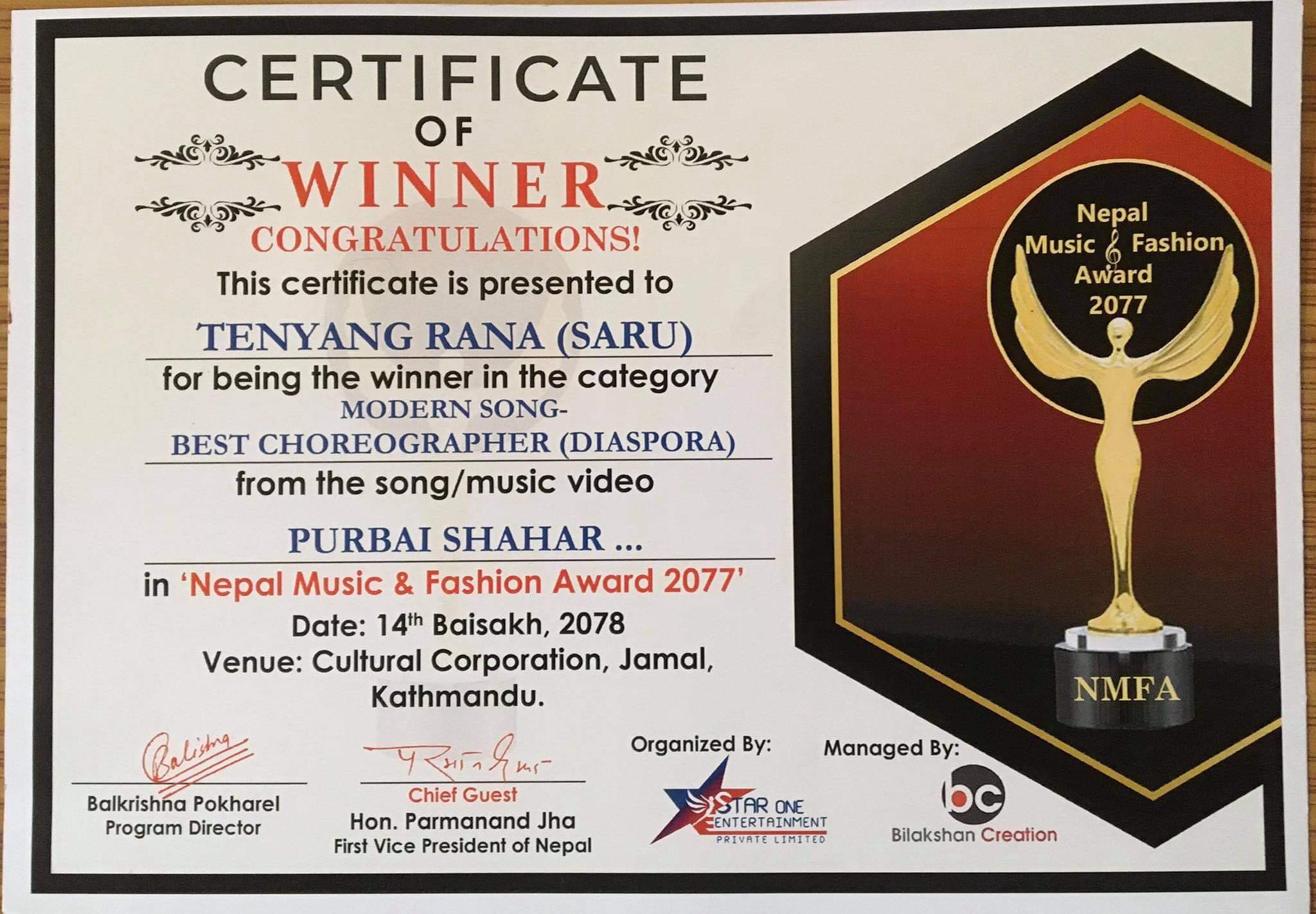 बेलायतमा एक सफल कोरियोग्राफर निर्देशकको रुपमा स्थापित कलाकार तथा पहिलो गुरुङ चलचित्र पाते की नायिका एबम बेलायत स्थित मगर संघ यूके तथा तमु समाज यूके सांस्कृतिक सचिव समेत रहेकी सरुले राजेश पायल राई र नीलम रोजु राईको स्वर रहेको गीतमा सान्ता कुमार राईको निर्देशन रहेको र मेडेलमा नाईका मगर गट ट्यालेन्ट विनर सलिना थापा मगर र सन्तोष राईको दम्दार नृत्य रहेको ‘पूर्वै सहर’ आधुनिक गीत भिडियो उत्कृष्ट कोरियोग्राफरका रुपमा अवार्ड पाएकी हुन् ।साथै निर्देशक बम्बुले शन्ताले उत्कृष्ट निर्देशक (डायस्पोरा) बिजेता हासिल गर्न सफल समेत भएका थिए ।