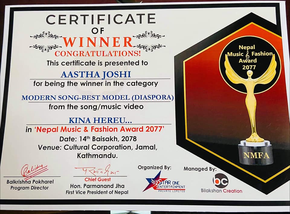 यसै गरि आधुनिक गीतमा बेस्ट मोडलको अवार्ड जितेकी मिसेस नेपाल यूके २०१७ बिजेता आस्था जोशी बटाजु हुन् । उक्त गीतमा चर्चित गायक टंक बुढाथोकीको स्वर र संगीतमा रहेको छ । सर्वेन्द्र अधिकारीको शब्द र अभिनय, विकेश बस्नेतको पनि अभिनय रहेको छ ।त्यस्तै जोशीले ‘किन हेरेउ’ आधुनिक गीत भिडियोबाट महिलातर्फ सर्वोत्कृष्ट मोडलका रुपमा अवार्ड पाएकी हुन् उक्त भिडियो बेलायतका चर्चित भिडियो निर्देशक कुशल श्रेष्ठ द्वारा निर्देशित रहेको छ।