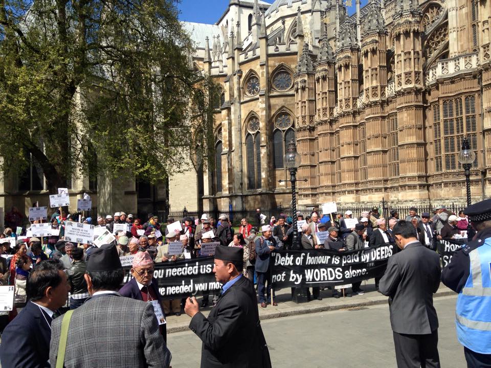 लण्डन । आफूहरुलाई अझै पनि समान अधिकार नदिइएको गुनासो गर्दै आएका भूपू गोरखाहरुले प्रतिक्रियास्वरुप विहीबार विरोध प्रदर्शन गरेका छन् । भर्तोको दुईसय वर्ष पुगेको अवसरमा बेलायती प्रधानमन्त्रीको कार्यालय १० डाउनिङ स्ट्रिटमा आयोजित विशेष समारोह भाँड्न उनीहरुले प्रदर्शन गरेका हुन् । प्रदर्शनमा बेलायतका विभिन्न भागबाट आएका करिब ५०० गोरखाहरु सहभागी थिए । सरकारी तवरबाट आयोजना गरिएको विशेष परेड हुने बेला पारेर नै गोरखाहरुले प्रदर्शन आयोजना गरेको संयुक्त गोरखा सत्याग्रह संघर्ष समितिका संयोजक कृष्णबहादुर राईले बताए । राईले नेपालमा भुकम्पले देश र जनता रोइरहेका ,ठूलो धनजनको क्षति र पूरा देश पीडामा भएको बेला बेलायत सरकारलाई विशेष कार्यक्रम रोक्न आग्रह गर्दा पनि नमानेपछि विरोध प्रदर्शन गरेर अवरोध गर्न बाध्य हुनु परेको जानकारी दिए । आक्रोशीत भूपू गोरखाहरुले २०० वर्षका अवसरमा आयोजना गरिने सबै कार्यक्रम अवरोध गर्ने चेतावनी दिएका छन् । तर आज गरिएको विरोध प्रदर्शन भने सान्दर्भिक नभएको कतिपयको धारणाा छ । बेलायतले नेपालमा गएको भुकम्पका लागि त्यत्रो सहयोग गरिरहेको बेलामा विरोध प्रदर्शन गरिनु त्यति सान्दर्भिक नभएको आलोचकहरुको भनाइ छ ।