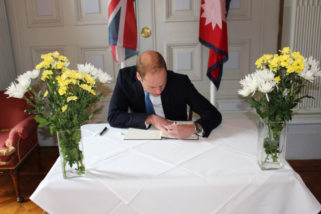 कार्यवहाक राजदूत तेजबहादुर क्षेत्रीले स्वागत गर्दै बस्न अफर गरे । चिया पिउन क्षेत्रीले गरेको अफरमा भने विलियमले छोरासित भर्खर ब्रेकफाष्ट खाएको भन्दै चिया पिउन मानेनन् त्यसपछि उनले नेपालमा गएको महाभूकम्प र यसले पारेको जनधनको क्षतिप्रति दुःख व्यक्त गर्दै राहत समाग्री वितरण अन्तर्राष्ट्रिय समुदायको सहयोगबारे जिज्ञासा राखेका थिए । पछि विलियमले दूतावासमा राखिएको शोक पुस्तिकामा हस्ताक्षर समेत गरे । राजकुमार विलियमले दूतावासमा झुण्ड्याइएको तत्कालिन राजा महेन्द्र र वीरेन्द्रले बेलायत भ्रमण गर्दाको बडेमानको तस्विर खुब चासोपूर्वक अवलोकन गरेको कर्मचारीले जनाए । उनी भवन पछाडिको गार्डेन समेत हेर्न गए । ‘वाउ सो नाइस’ उनी प्रशंसा गर्दै थिए ।