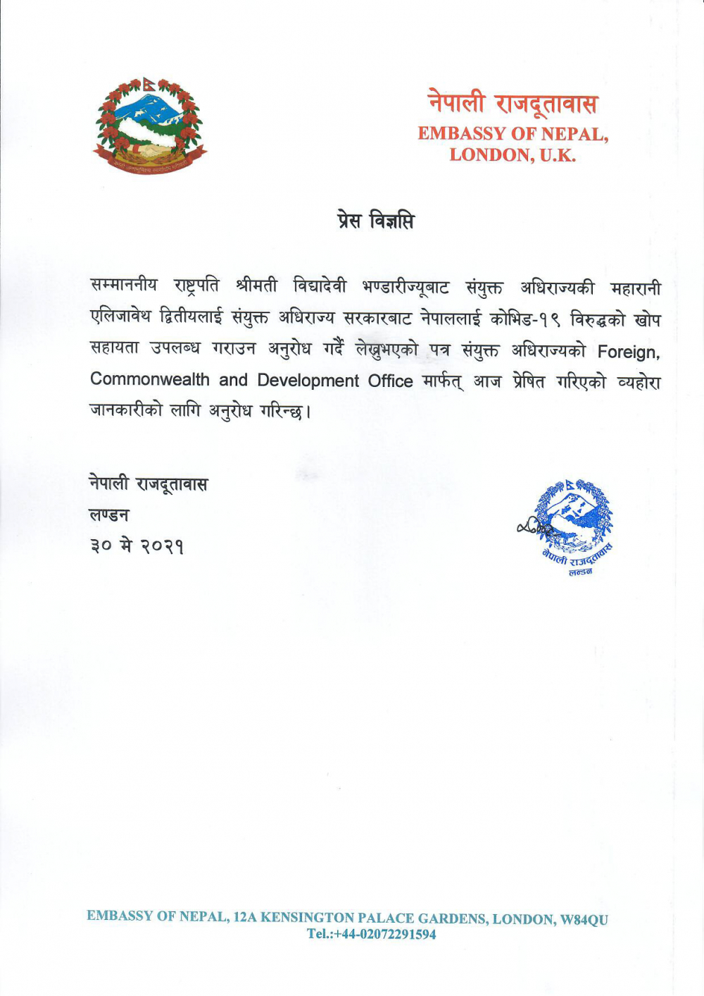 लन्डन दूतावासका अनुसार राष्ट्रपतिको पत्रलाई आइतबार बेलायती बिदेश मन्त्रालयमा बुझाइएको छ । यसअघि बेलायत सरकारले नेपालमा स्वास्थ्य सामग्री पठाइसकेको छ ।
