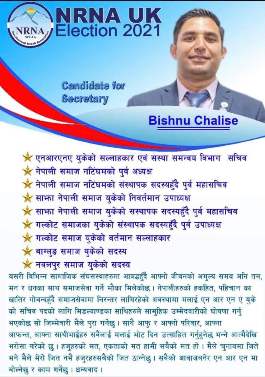 लण्डन । गैर–आवासीय नेपाली संघ (एनआरएनए)यूकेको आसन्न निर्वाचनमा मिडल्याण्डबाट सफल युवा व्यवसायी, सामाजिक व्यक्तित्वका धनी तथा सक्रिय समाजिक अभियन्ता बिष्णु चालिसेले सचिव पदमा उम्मेद्वारी दिने भएका छन्।