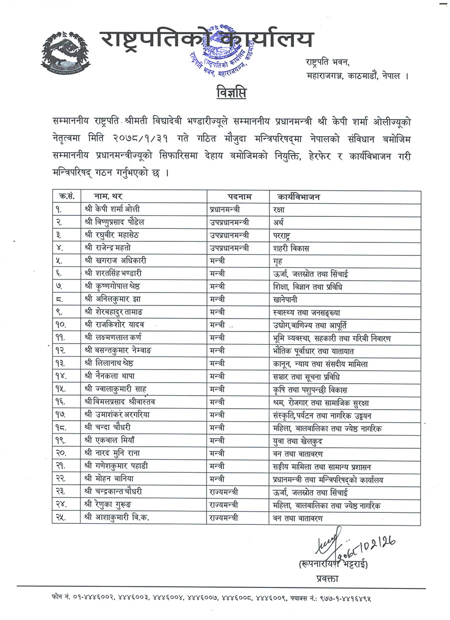 संविधानतः मन्त्रिपरिषद २५ सदस्यीय हुने व्यवस्थाअनुसार २५ जना मन्त्री भएका हुन् ।
