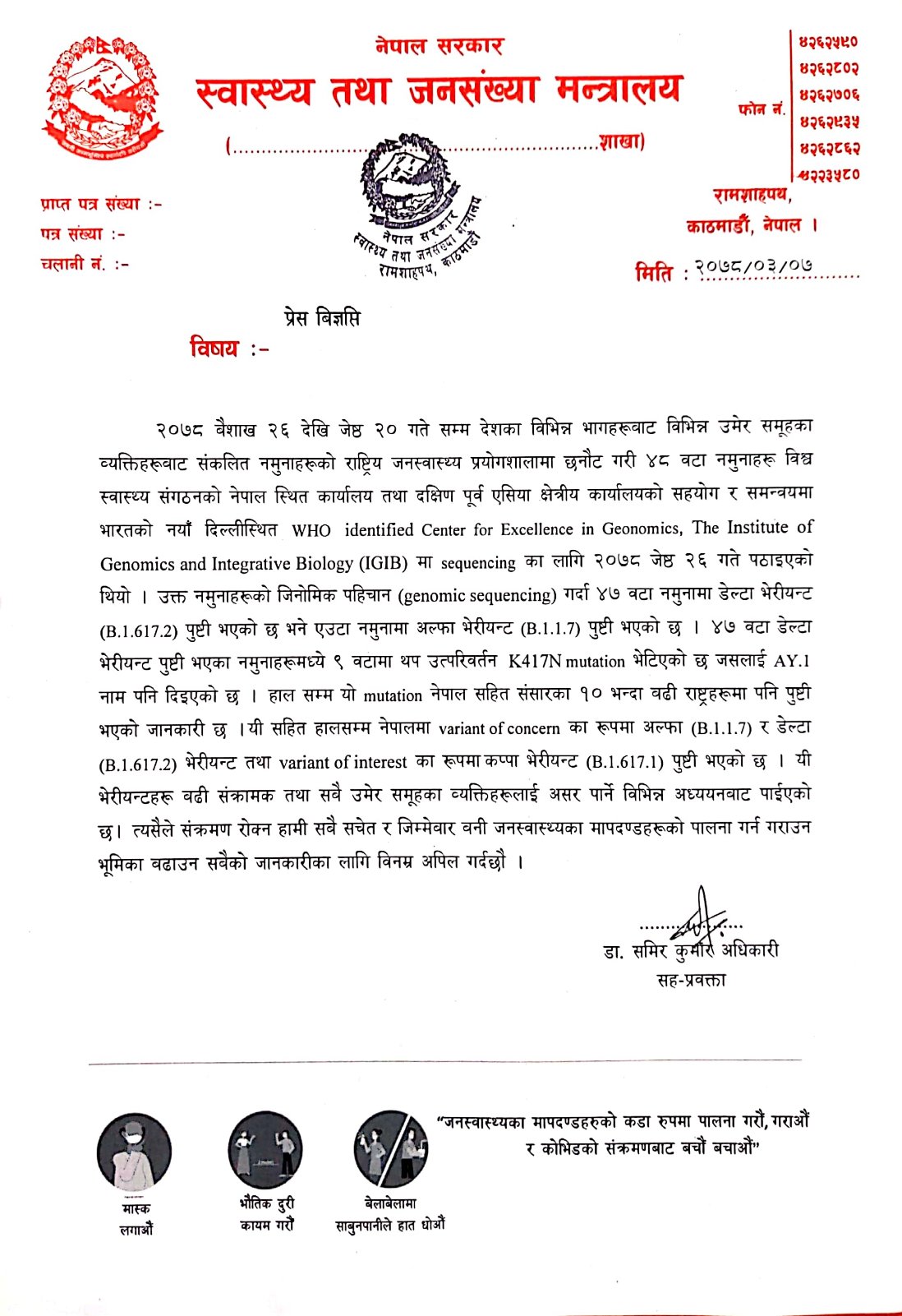 स्वास्थ्य तथा जनसंख्या मन्त्रालयले ४७ वटा डेल्टा भेरियन्ट पुष्टि भएका नमुनामध्ये ९ वटामा थप उत्परिवर्तन के ४१७ एन म्युटेसन भेटिएको जनाएको छ ।
