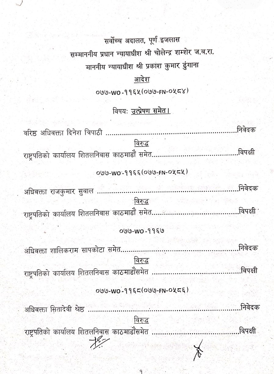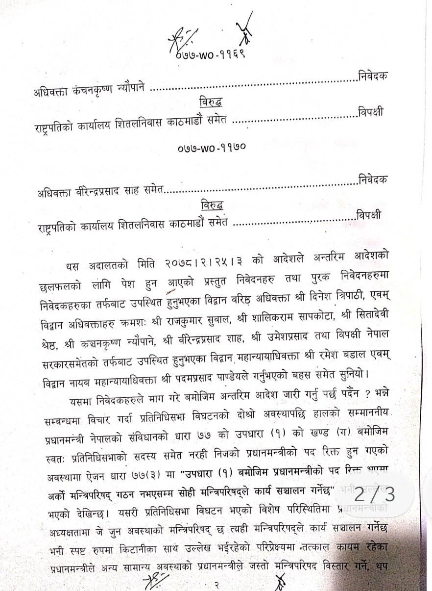 वरिष्ठ अधिवक्ता दिनेश त्रिपाठीले प्रतिनिधिसभा विघटन र निर्वाचन घोषणा भएको अवस्थामा गरिएको मन्त्रिपरिषद विस्तारको निर्णयविरुद्ध दायर गरेको रिटमा प्रधानन्यायाधीश चोलेन्द्रशमशेर राणा र न्यायाधीश प्रकाशकुमार ढुंगानाको संयुक्त इजलासले मन्त्रिपरिषद् विस्तारको निर्णय तत्काल कार्यान्वयन नगर्न अन्तरिम आदेश दिएको हो ।