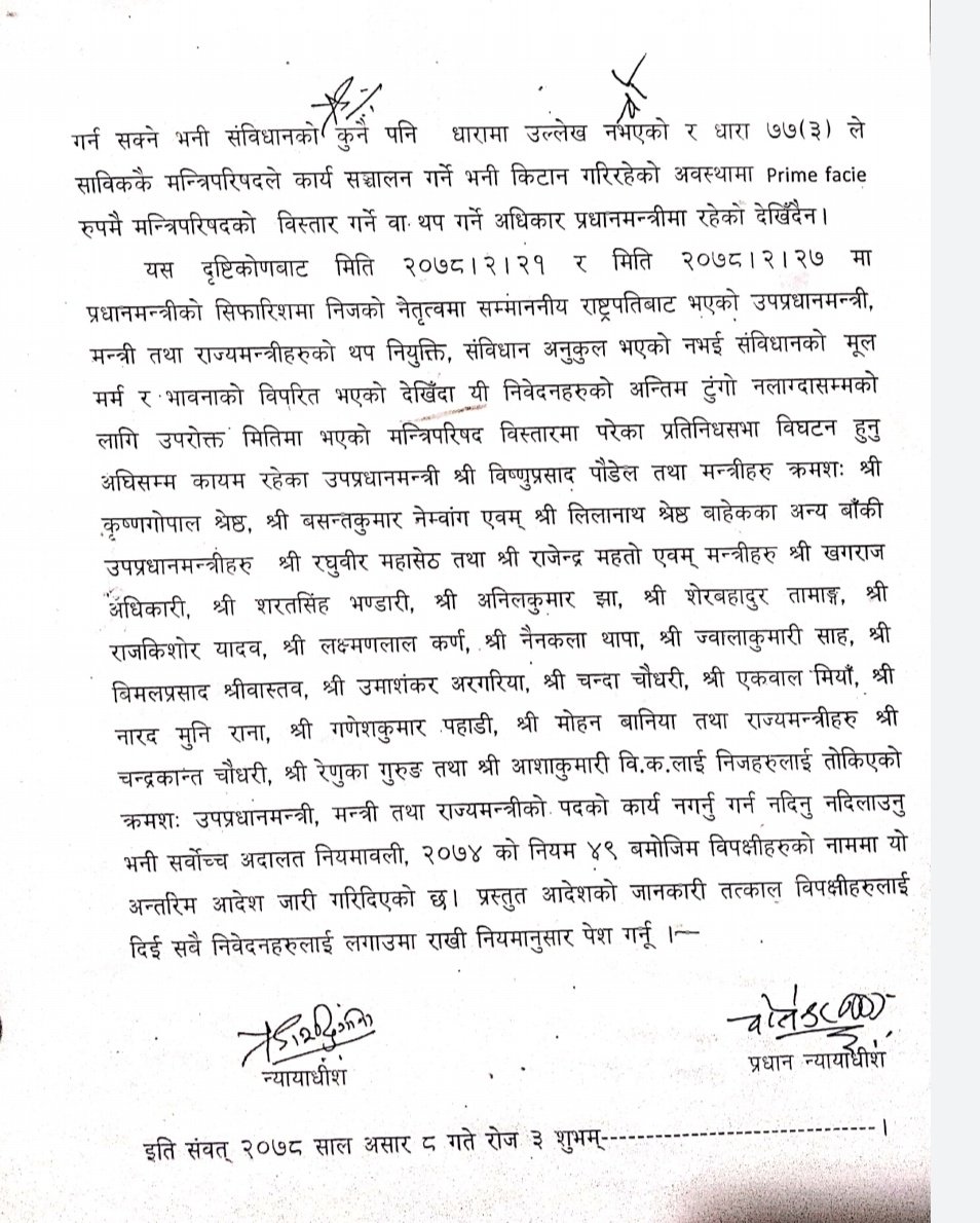 आदेशमा भनिएको छ, ‘२०७८ साल जेठ २१ र २७ मा प्रधानमन्त्रीको सिफारिसमा सम्माननीय राष्ट्रपतिबाट भएको उपप्रधानमन्त्री एवं मन्त्रीहरूको सपथ र कार्यविभाजन संविधान अनुकुल भएको नभई संविधानको मूल मर्म भावना विपरीत भएकोले निवेदनको अन्तिम किनारा नलागेसम्मका लागि मन्त्रिपरिषद विस्तारको निर्णय कार्यान्वयन नगर्न’