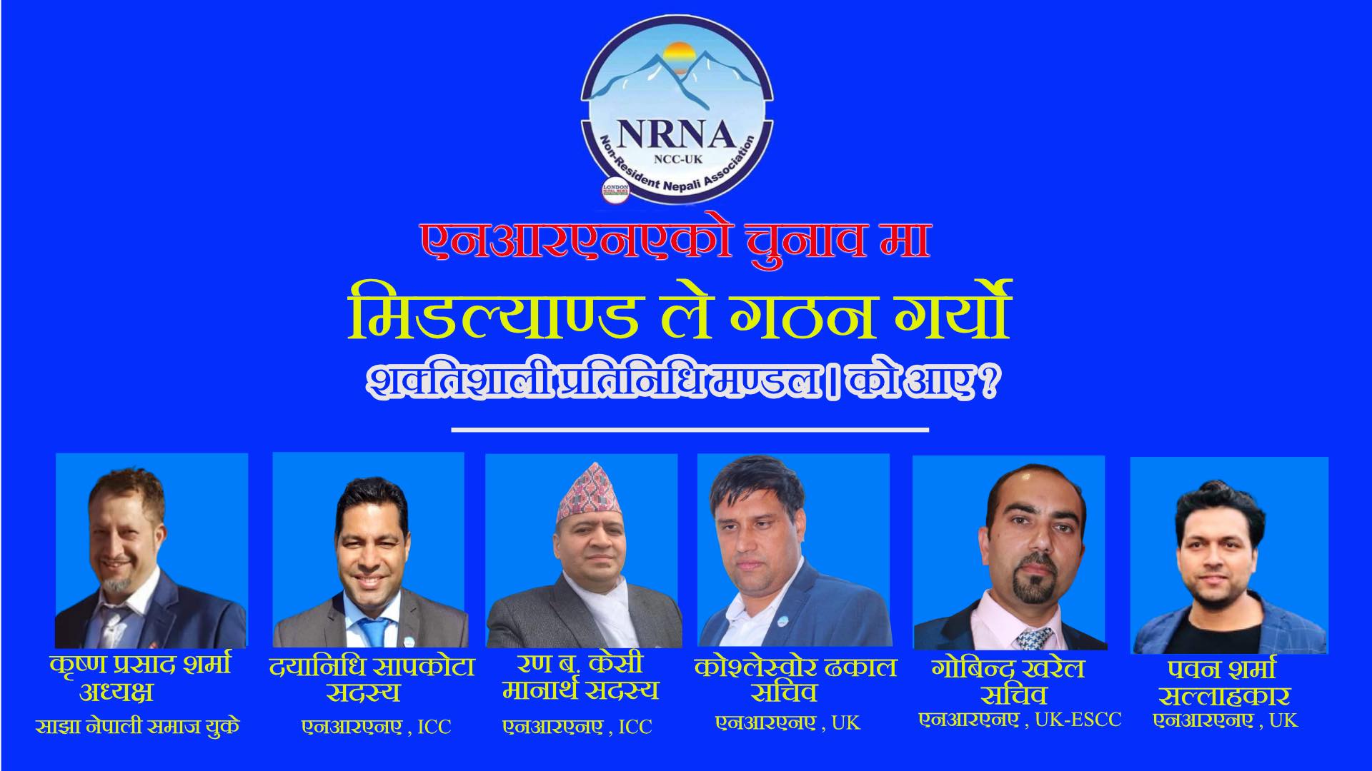 सहभागि सबैको सहमतिमा एनआरएनए यूके २१–२३ को निर्बाचनको केन्द्रमा सहमति एवं सहकार्य गर्न र निर्बाचन सम्बन्धी अन्य कार्य गर्न ६ सदस्यीय एनआरएनए यूके मिडल्याण्ड प्रतिनिधि मण्डल गठन गरेको छ ।