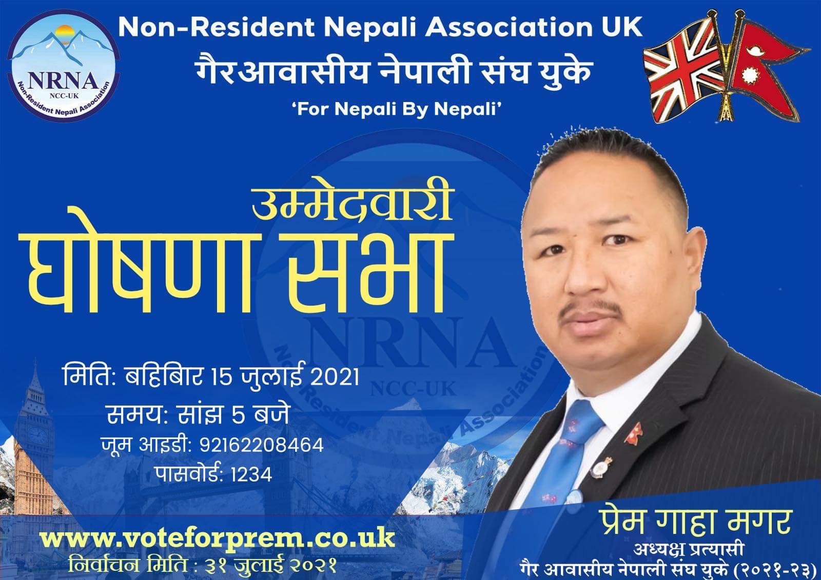 एनआरएन युके अध्यक्षका उम्मेदवार प्रेम गाहाले ७ बुँदे घोषणा पत्र सहित १५ जुलाईमा घोषणा सभा गर्ने