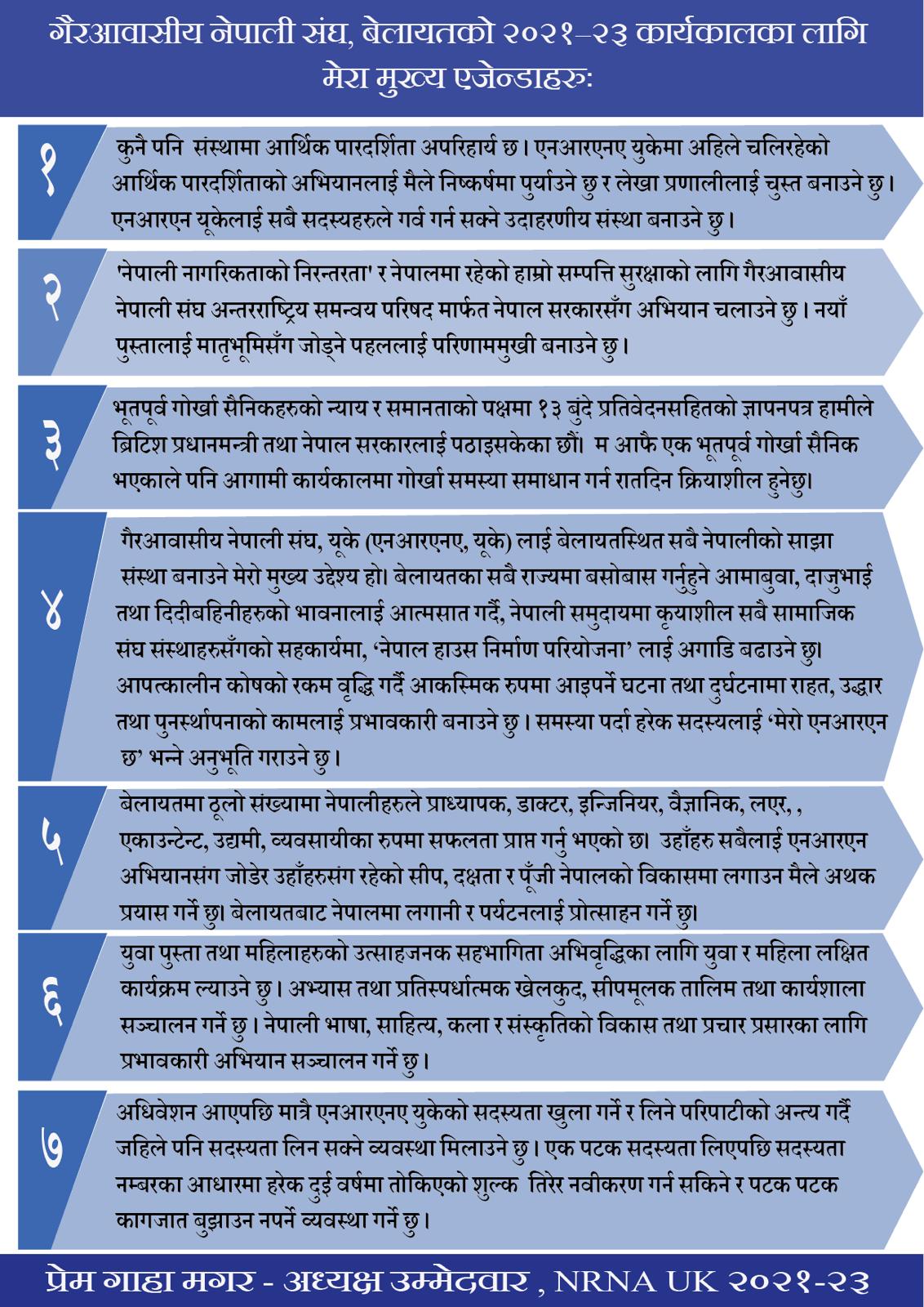 सात–बुँदे एजेण्डासहित उम्मेदवारी घोषणा गरेका गाहा मगरले संस्थालाई पारदर्शी बनाउने, पूर्व गोर्खाहरुको समस्या समाधानमा नेतृत्वदायी पहल गर्ने, नेपाल हाउस परियोजनालाई पूर्णता दिने, नेपाली नागरिकता निरन्तरता र नेपालस्थित पुर्ख्यौली सम्पत्तिमाथिको अधिकार, नेपालमा लगानी अभिवृद्धि र पर्यटन प्रवर्द्धन, संस्था सुदृढीकरण तथा सदस्यताका लागि नयाँ प्रावधान, युवा तथा महिलाको उत्साहजनक सहभागिता र सशक्तीकरण लगायतका मुद्दालाई आफ्नो कार्ययोजनामा समेटेका छन् ।