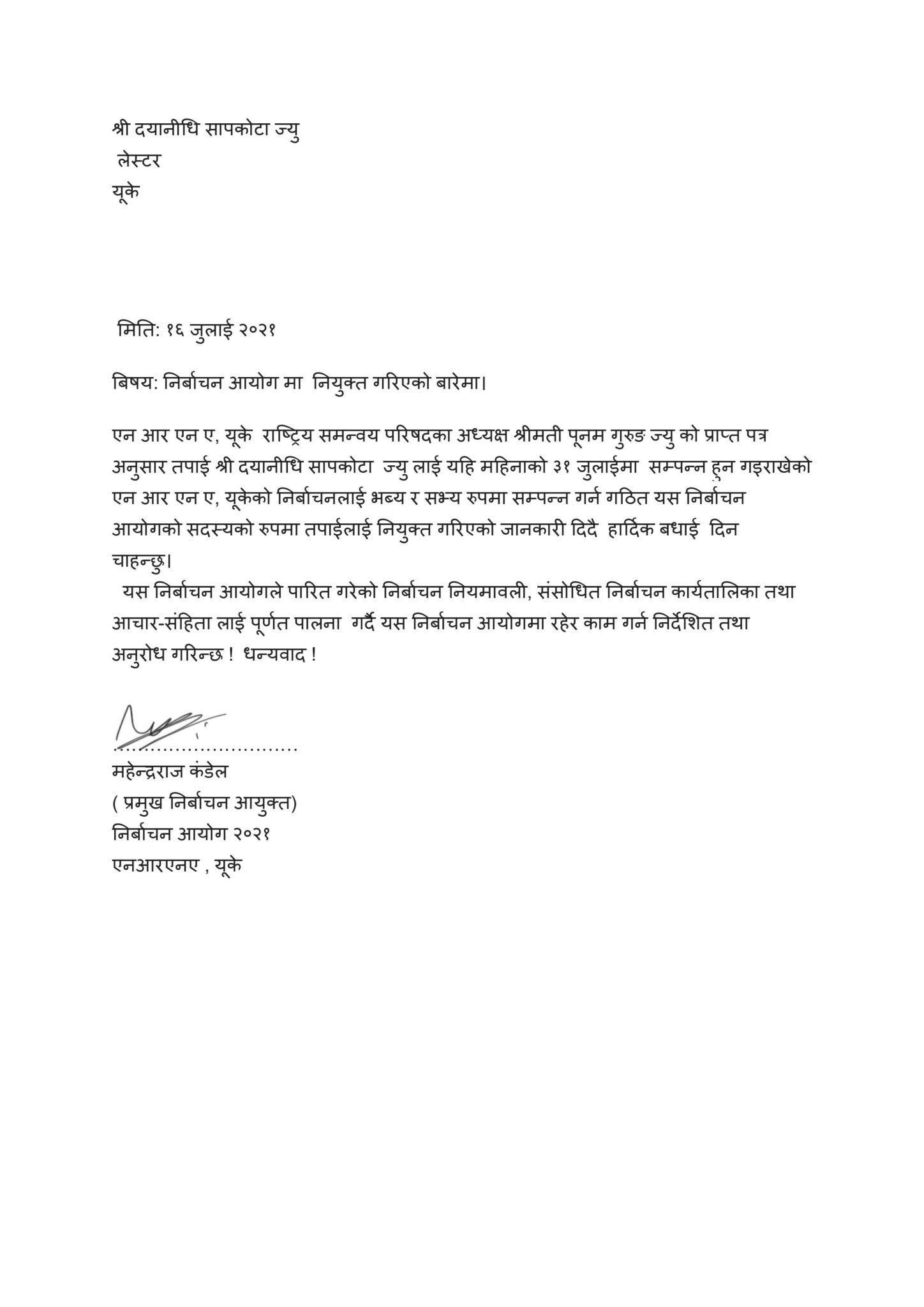 आइसीसी सदस्य सापकोटा एनआरएनए यूकेको निर्वाचन समितिमा मनोनयन (पत्र सहित)