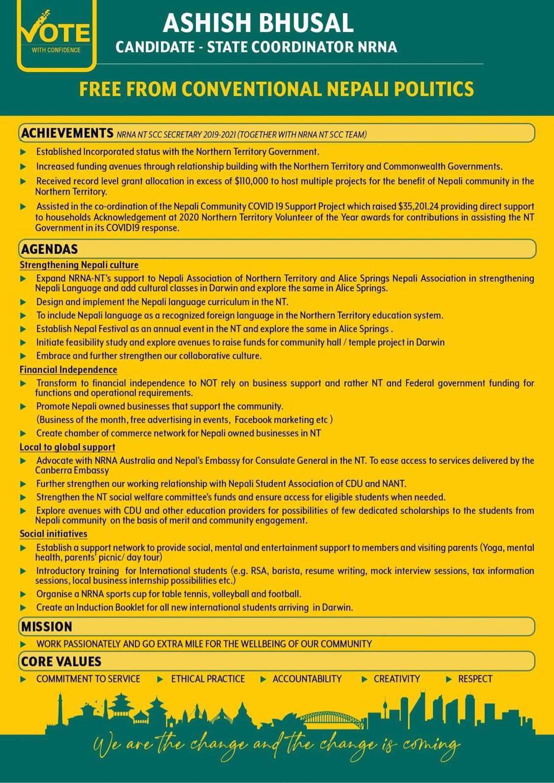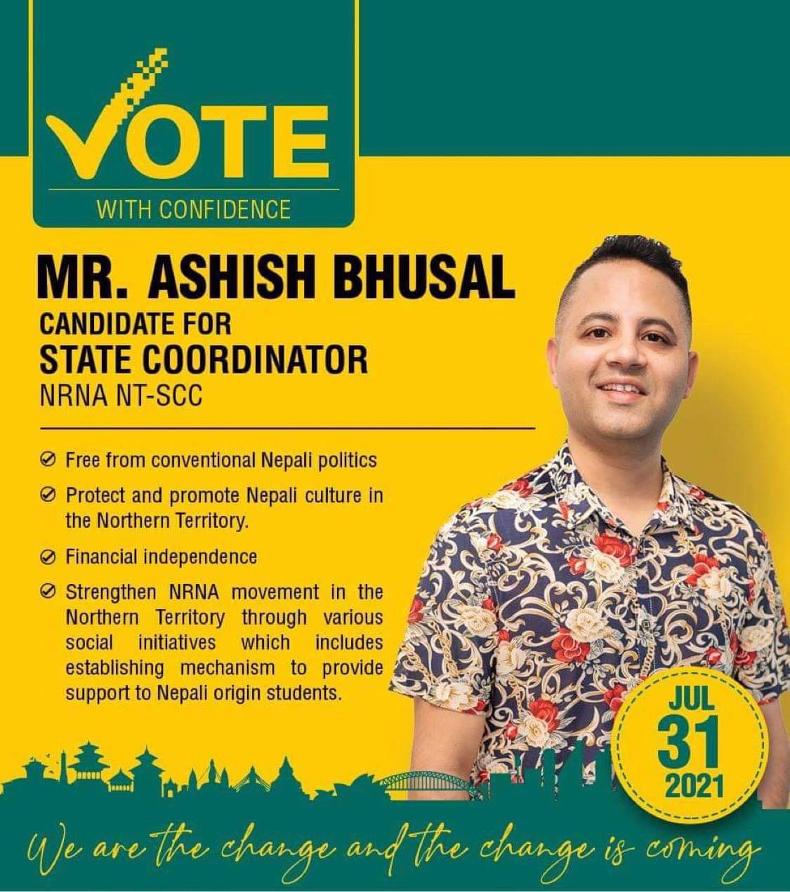 सिड्नी । गैरआवासीय नेपाली संघ (एनआरएनए) नर्दन टेरिटोरीको संयोजक पदमा युवा आशिष भुसालले उम्मेद्वारी दिएका छन् ।