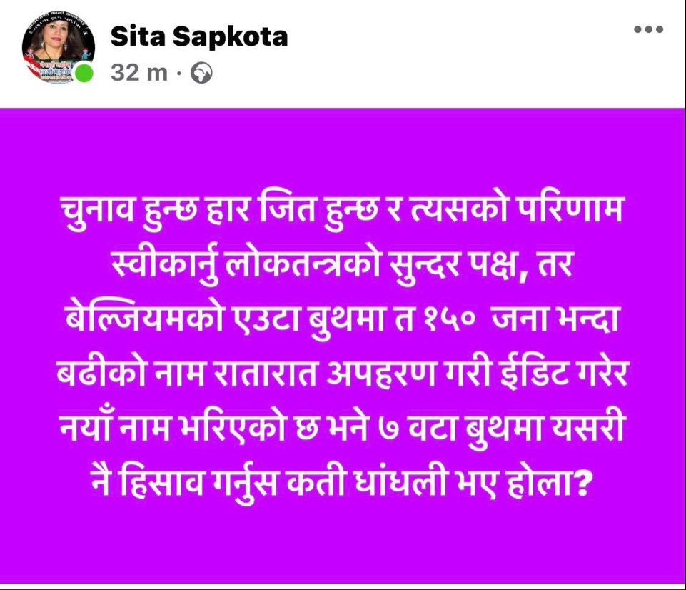 नेपाली जनसम्पर्क समिती बेल्जियम सभापति सीता सापकोटाको स्टाटस यस्तो छ ?