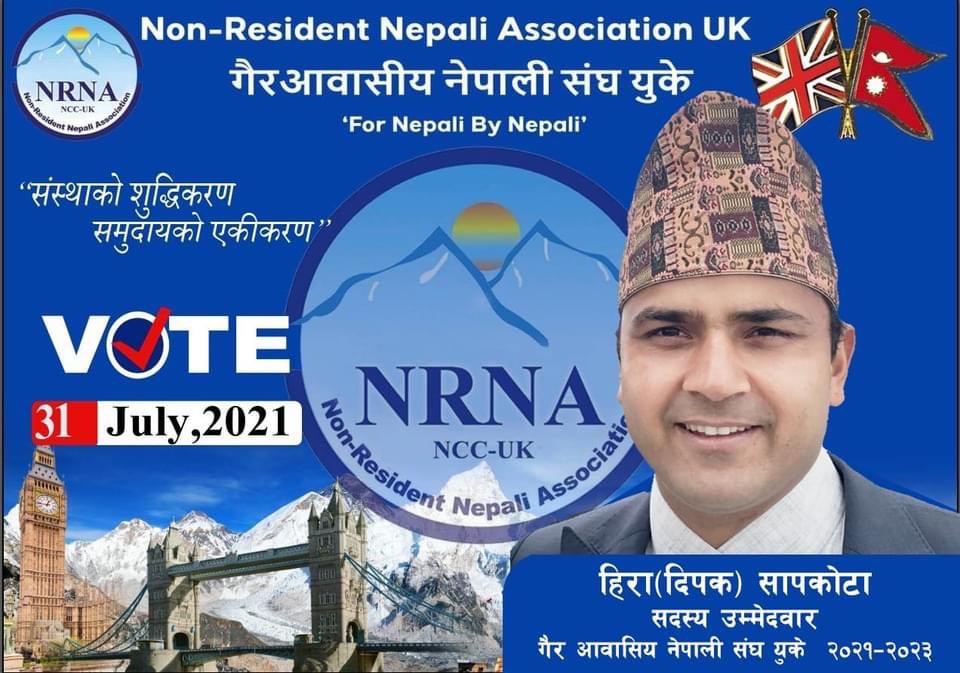 लण्डन । गैरआवासीय नेपाली संघ (एनआरएनए) यूकेको सदस्य पदमा उम्मेद्वारी दिएका हीरा सापकोटा (दीपक) ले एनआरएनए सुधारको मुख्य एजेन्डासहित चुनावी अभियानमा लागेका छन् ।