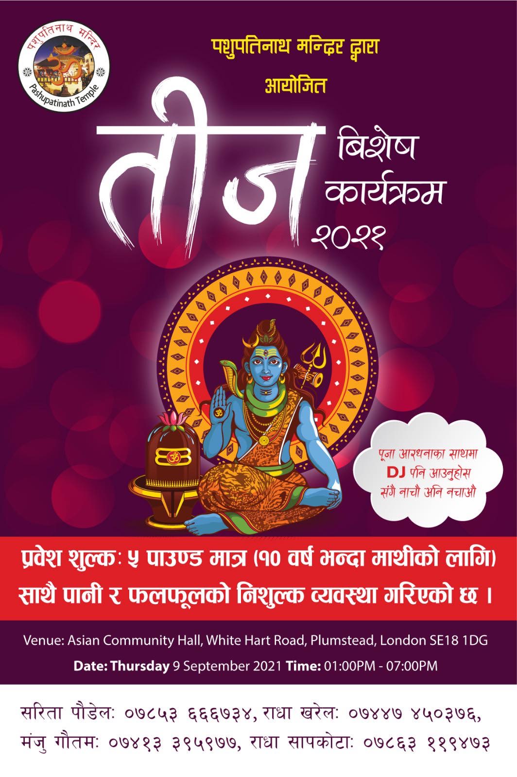 यसै क्रममा लण्डनमा बस्ने नेपाली नारीहरुको लागि यस वर्षको तीजमा लण्डनको प्लमस्टिड स्थित एशियन कम्युनिटी सेन्टरमा हरितालिका तीजको उपलक्ष्यमा भव्य पूजाआजा सहित नाचगान र एक विशेष कार्यक्रम आयोजना हुने भएको छ ।पशुपतिनाथ मन्दिरको आयोजनामा तीजको दिन (९ सेप्टेम्बर)मा तीज विशेष पूजाआजा तथा नाँचगान सहितको विशेष कार्यक्रम आयोजना गरिएको हो ।