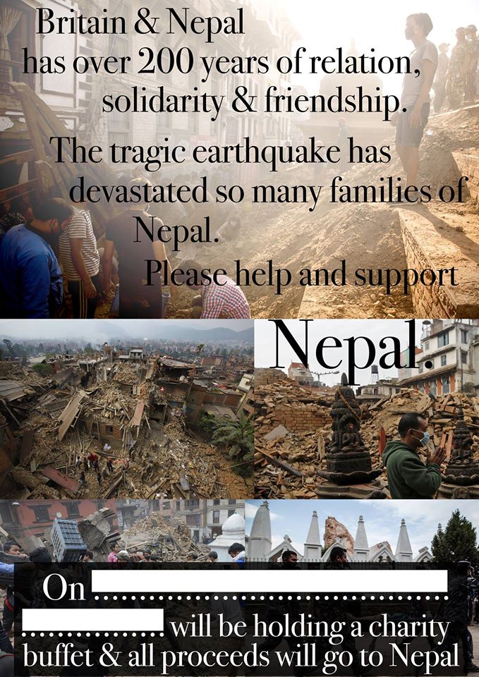 नेपलिज क्याटरिंग एसोसिएसन युकेले आफ्ना सदस्य रेस्टुरेन्टहरुलाई एक दिन च्यारिटी आयोजना गरी सोबाट आर्जन हुने कमाइ नेपालका भुकम्प पीडितलाई दिन आहृवान गरेको छ ।